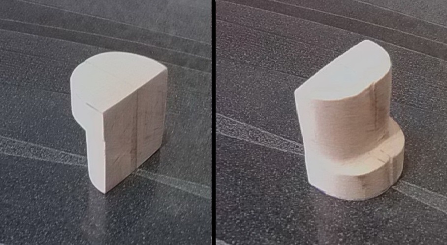 Чёпик в рукояти уже был готов,поэтому пришла очередь «носа» цевья.Заготовку сделал из такой же индийской деревяшки.Также сделал и пластиковую прокладку.Засверлил 2 отверстия не глубоких в ней для крепежа к ложе.Потом по ним сделал отверстия в прокладке.Обе детали были с припуском для обработки: