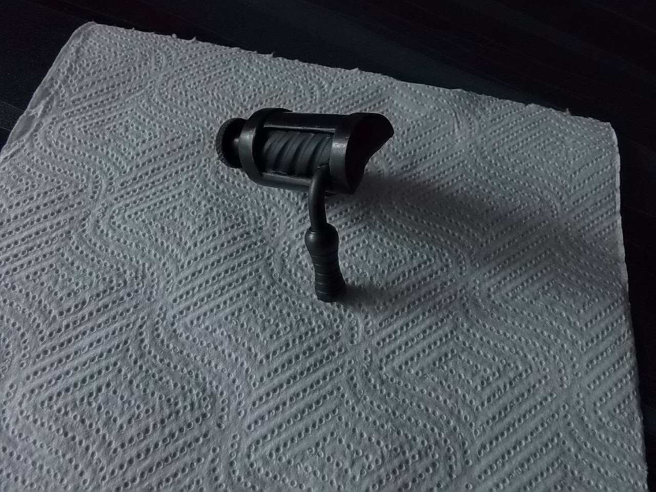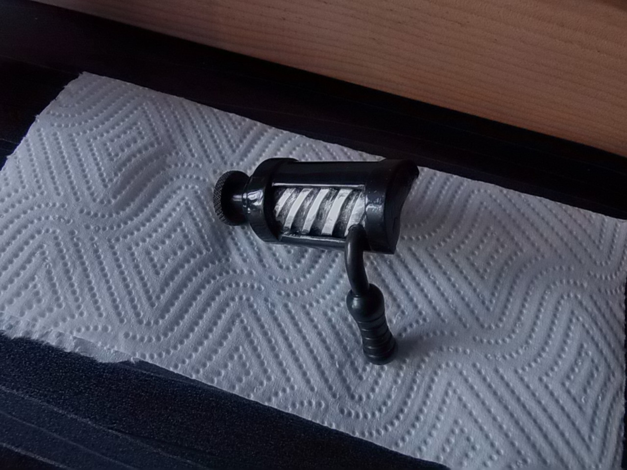 Прокладку сделал из белого пластика от электрокороба,чёпик выпилил и обработал с неимоверным усердием из-за прочности из показанной выше древесины: