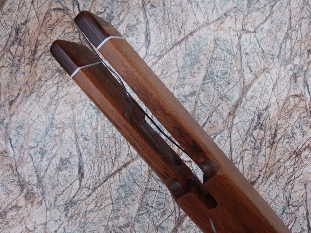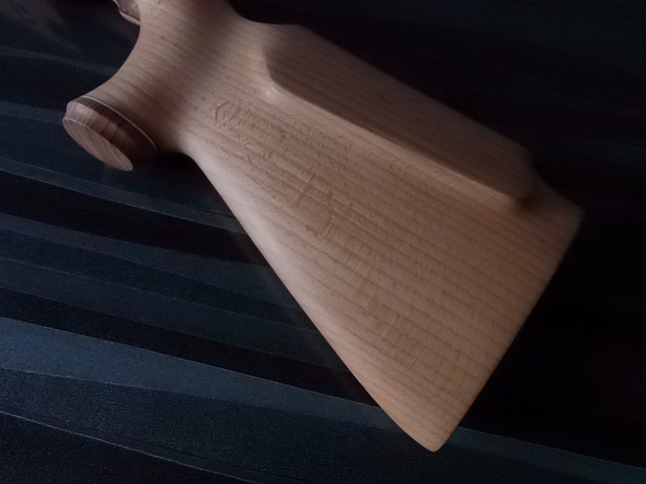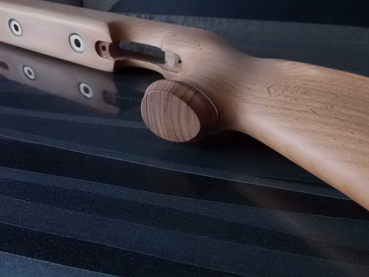 Обрабатывать сразу эту деталь не стал. Очень широким оставался паз под пластиковую муфту винтовки. Поэтому решил вклеить сразу вставочки из бука в передней части ложи.Хотелось более аккуратного вида в области казны винтовки,да и заглушить надёжно компрессор в передней части («рогах») от смещений.Сделал две симметричные заготовки из бука по внутренним очертаниям.Потом вклеил их на ЭДП.Заготовочки вклеились надёжно: