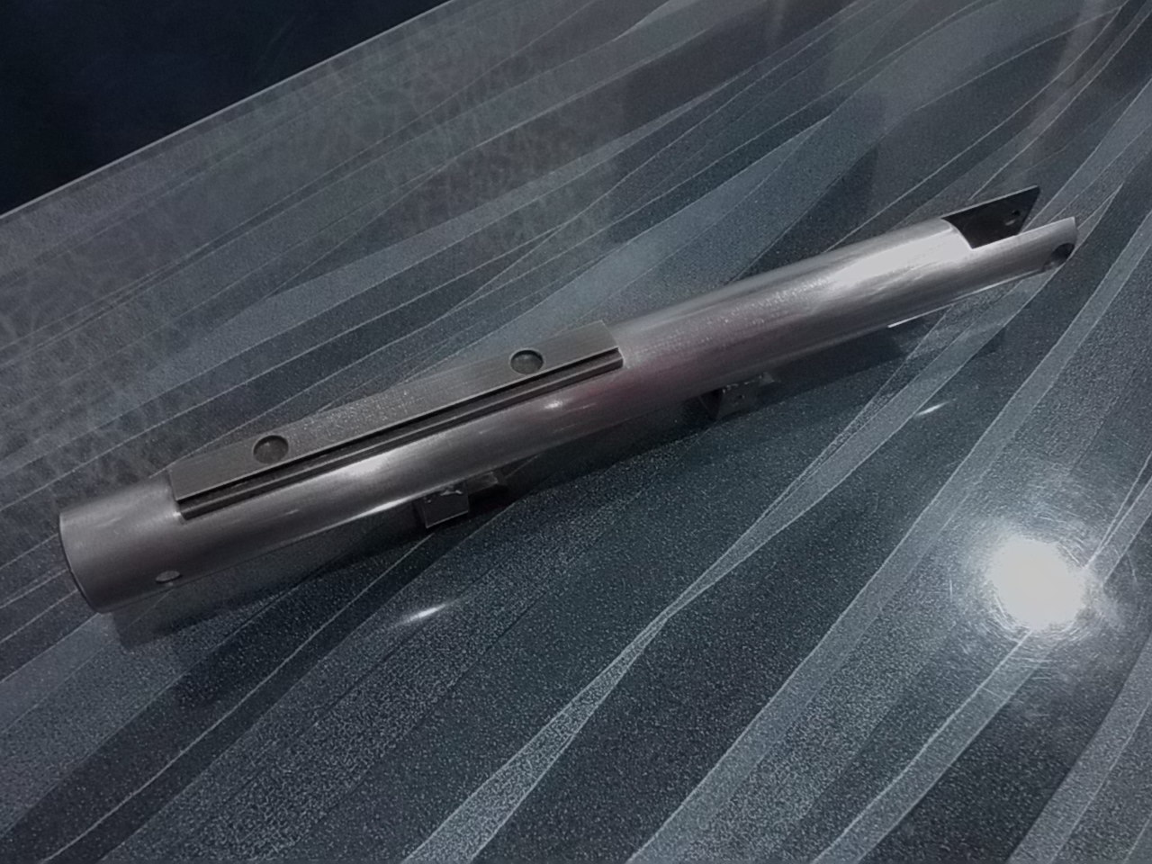 Попутно немного доработал и ствол.Фаской на дульном срезе,как водится у «ИЖМЕХ» даже не пахло.На токарном станке легонько отторцевал,сделал далее аккуратную лёгкую фасочку.Резьбу на конце ствола М12Х1 также поправил после резца.Примерно так,может рассмотрите что:
