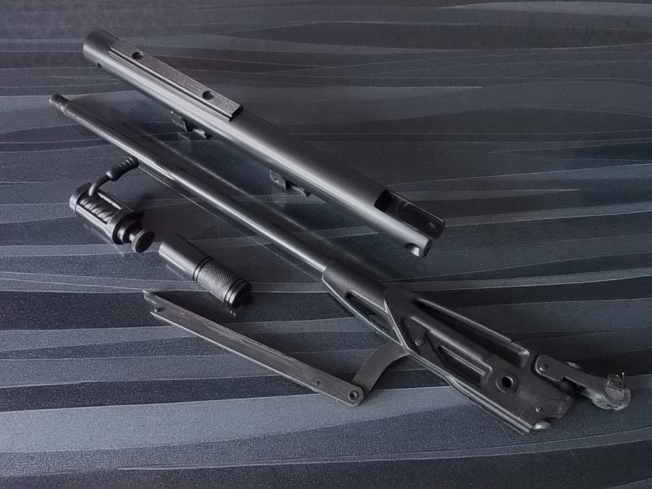 Покрытое ржавчиной железо было обильно покрыто аэрозолью WD-40,оставлено на отмокание на сутки.После протёр всё обработанное мягкой тканью,затем обрызгал нейтральным ружейным маслом.Спустя ещё несколько часов протёр всё насухо.Итог-ну практически идеальным стало всё «железо». Ну а к тому времени нашлись некоторые детали в компрессор на замену.Приехали ко мне манжета новенькая с перепуском,пружина новая,стальная телескопическая направляющая /утяжелитель, ну и старенькая ложа от юниорского «Зуля» с затыльником и спусковой скобой.И вот таким стал весь наборчик к «Мурке»: