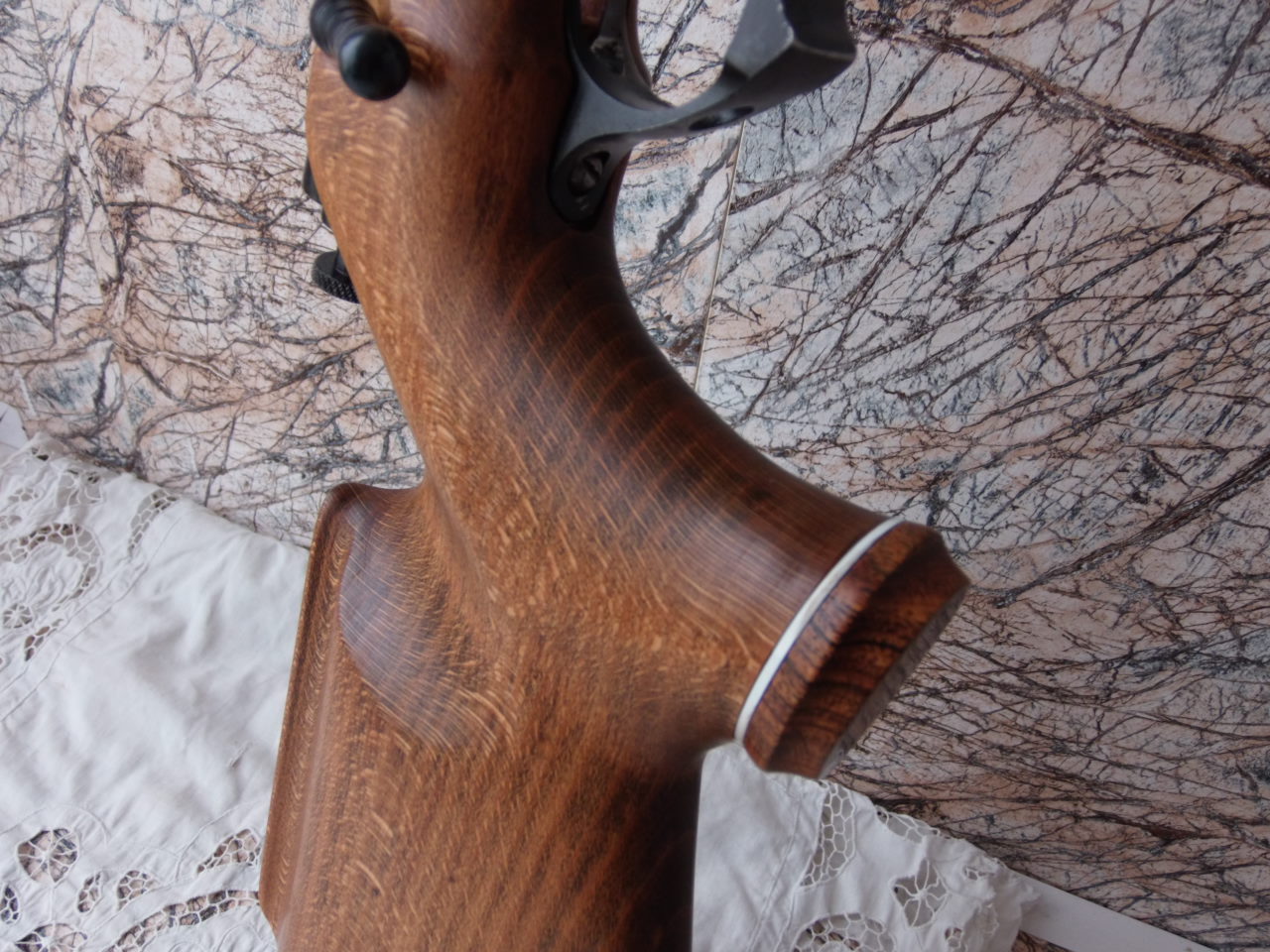 По состоянию канала ствола нареканий не было-нарезы чёткие,без коцок.Теперь пулька выходила из ствола с чёткими равномерными нарезами,что очень гуд! Далее решено было облагородить рукоять прокладкой с чёпиком.Для него выбрал красивую индийскую древесину-было пару кусочков в «загашнике».Вот такая она в виде дощечек раньше приходила к нам в качестве поддонов с индийским стеклопрутком,их мы и курочили на дощечки.Кто на что: