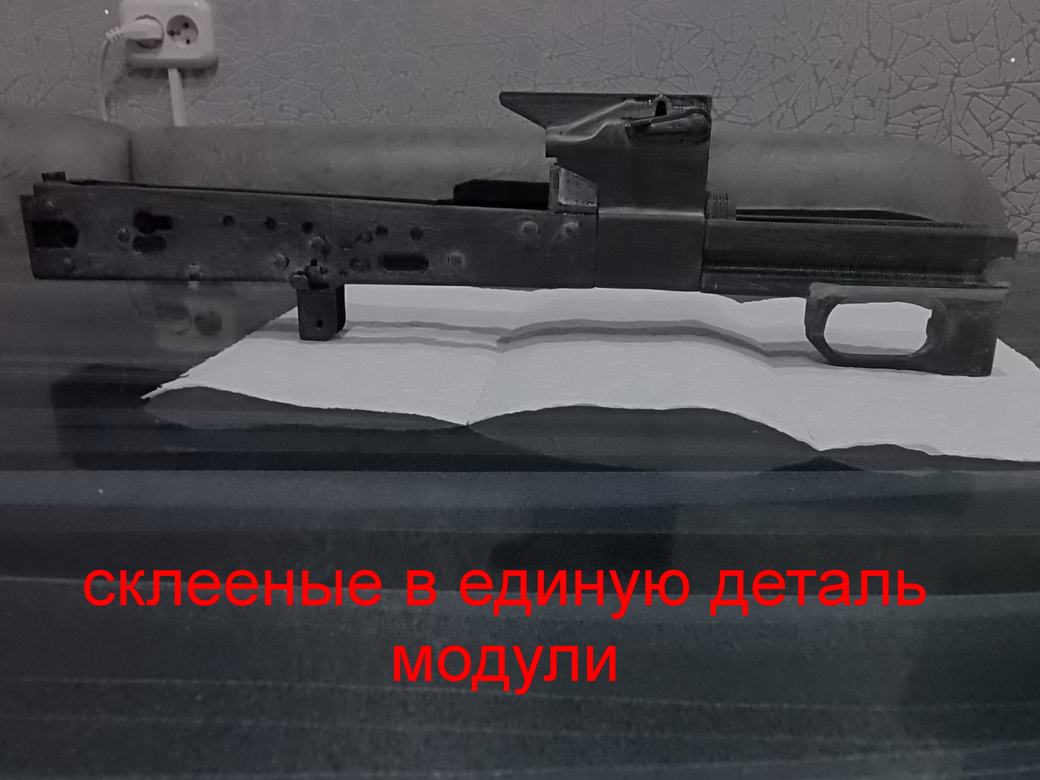 Первым делом напечатал коробку АК,модуль с колодкой под целик и разумеется сам корпус (ложу) для пистолета. Выполнено всё было отменно! Мне оставалось хорошенько зачистить напечатанные детали,зашпаклевать нужное,снова зачистить под покраску. Чтобы собрать воедино эти три модуля,применил я стальные шпильки. В каждом модуле были изначально предусмотрены отверстия под них. И после обезжиривания шпильки эти были вклеены в отверстия,а затем на тот же ЭДП всё было собрано в одну конструкцию.Вот снимки модулей: