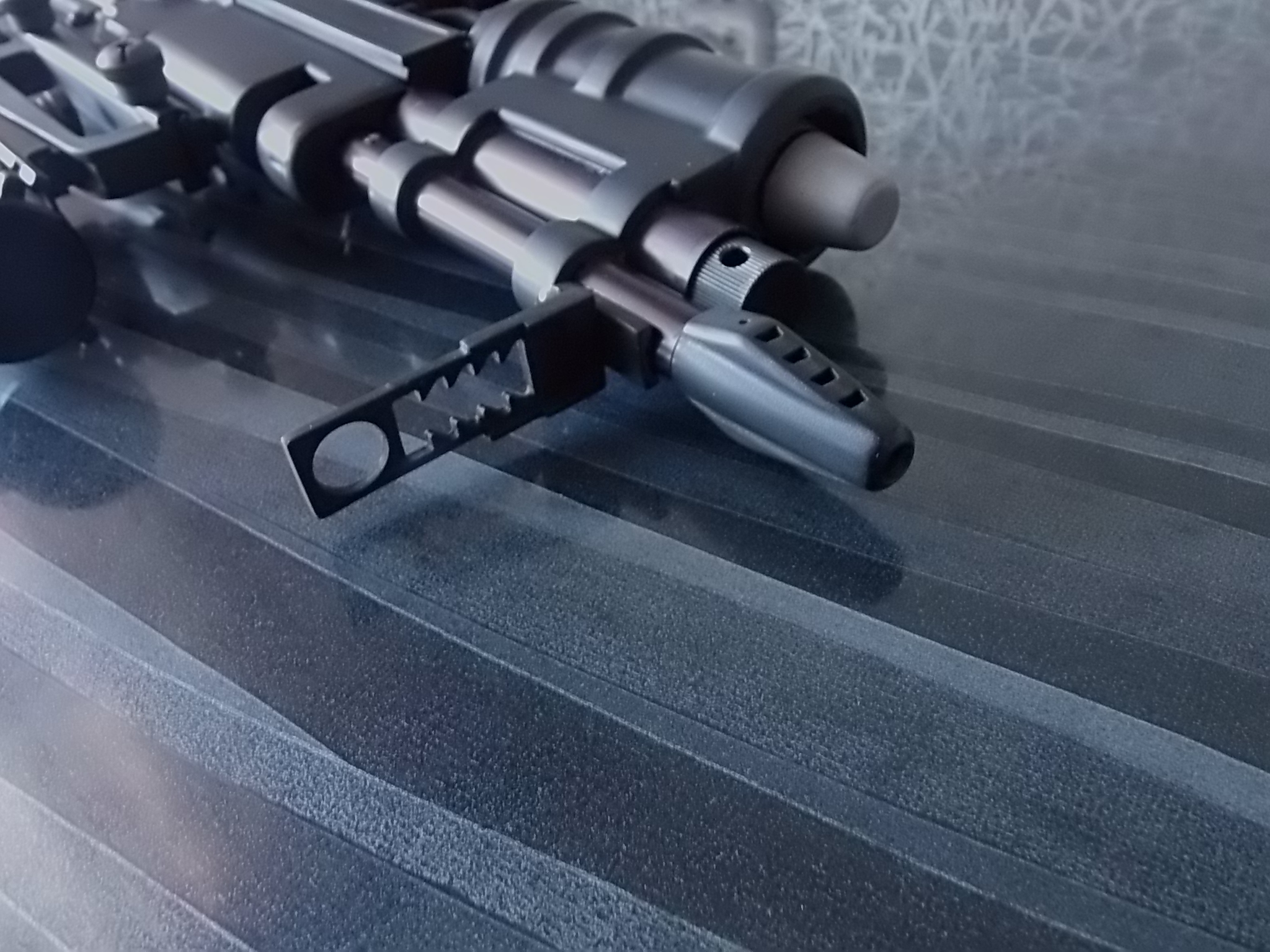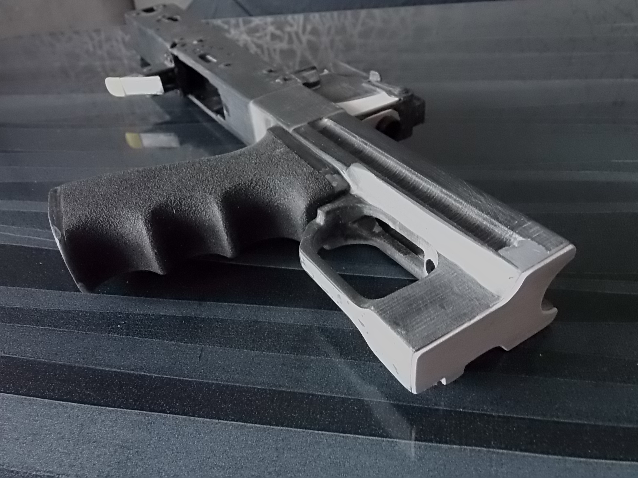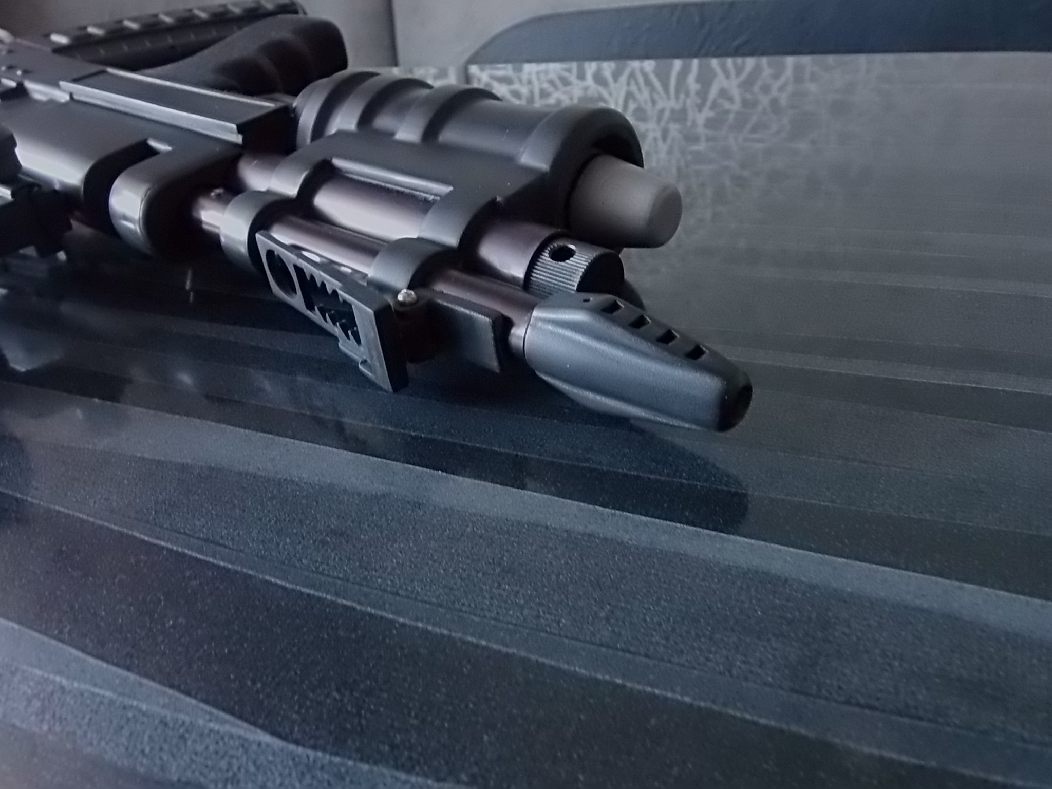 После этого добавил немного толщины в передке колодки целика приклеенными кусочками ПВХ пластика. Также сделал аккуратный торец тем же пластиком на корпусе под пистолет. Приклеил на ЭДП и притянул с внутренней стороны саморезом напечатанную эргономичную рукоять. Её я покрыл для удобства хвата мелкозернистым антигравием,оставив гладкие ободки сверху и снизу. Предусмотрел отверстие под взведённый затвор пистолета. Его облагородил вклеенной пластиковой трубочкой. С левой стороны в передней части скобы примудрил имитацию экстрактора гранаты из подствольника.Вышло так: