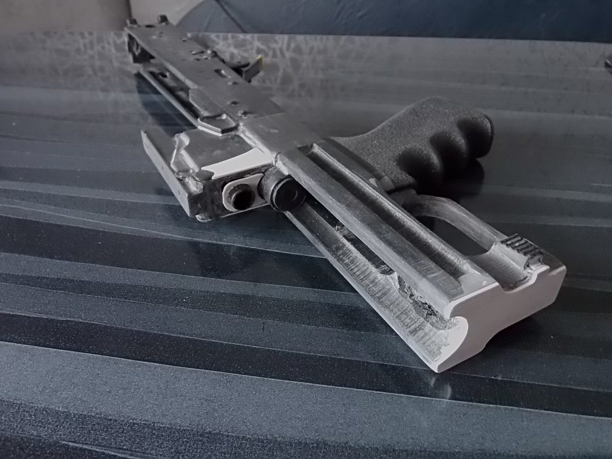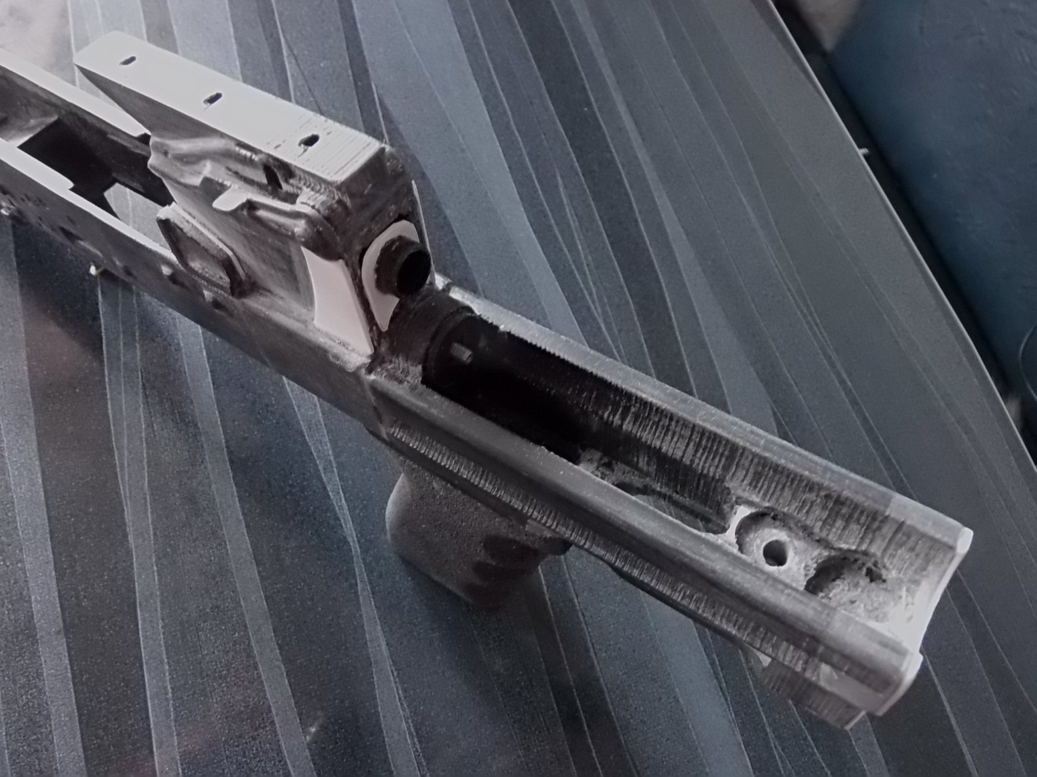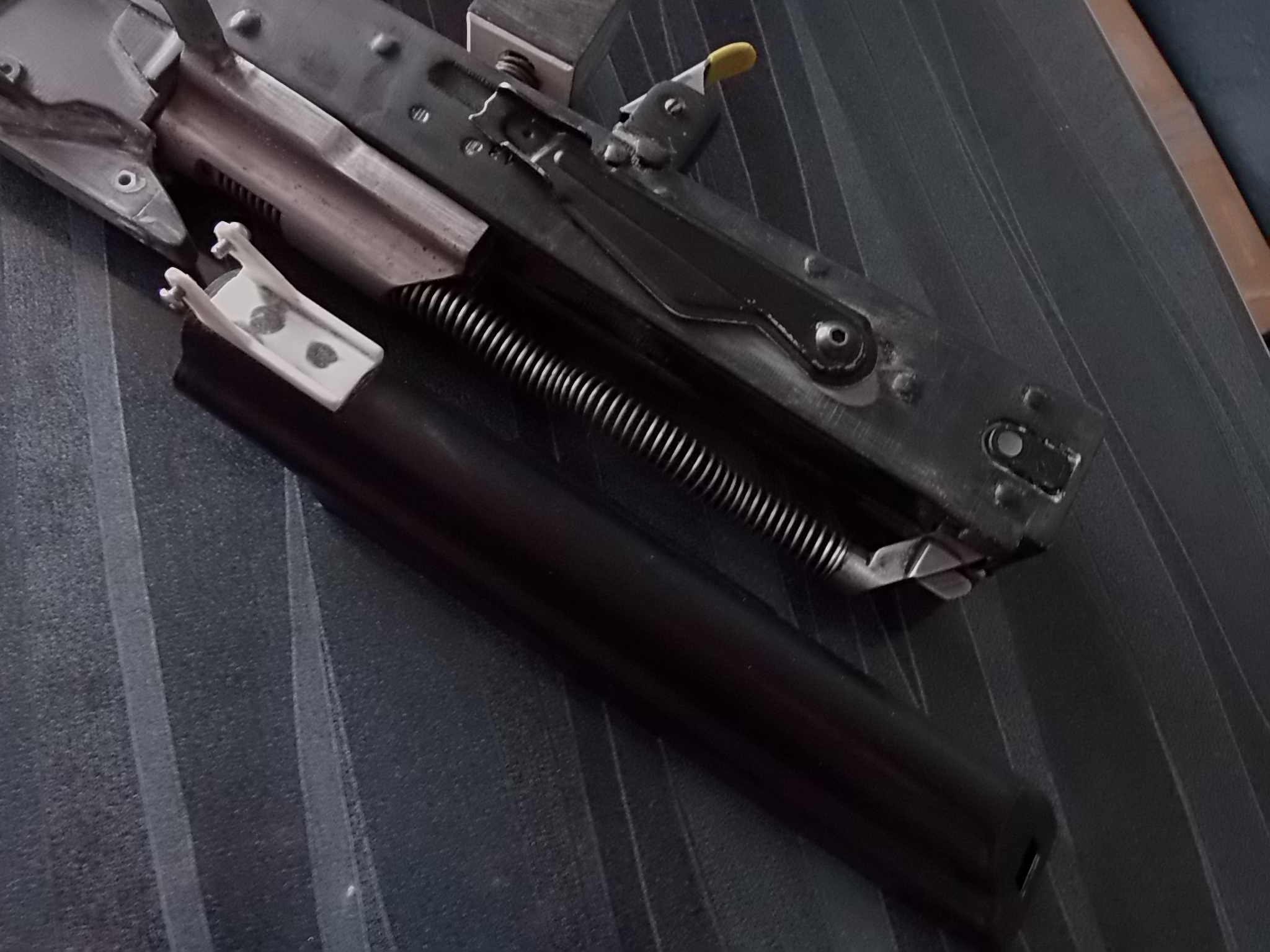 Теперь о затворной раме,возвратной пружине и крышке ствольной коробки. Крышка была взята от «Юнкера». В ОЦ-14 крышка с рёбрами. Я решил поставить обычную гладкую как в начальных версиях «Грозы». Затворная рама от того же «Юнкера». Я отрезал от неё всё что мне было не нужно,зачистил от появившейся ржавчины. Боевая пружина оттуда же-её укоротил на 8см. Очень тугая она была для моего изделия. Вообще изначально планировалось объединить затвор пистолета с этой затворной рамой-т.е. взведение затвора производить рамой «Юнкера». Но дело в том,что на коробке напечатанной салазки под раму были также пластиковыми,а по ним рама «Юнкера» очень плохо двигалась. Ах да! Чуть не забыл! Рама затворная подвижна! При сборке она вставляется в заднюю часть коробки на направляющие и двигается вперёд к казне как к примеру в АК. Но не удалось мне толком додумать такой интегрированный затвор,потому опустим это и забудем. Рама эта будет лишь антуражем,а взводиться и подавать боеприпас в казённую часть будет родной досылатель пистолета. Вот так складывалась картинка на тот момент.Всё крепится практически также как в АК: