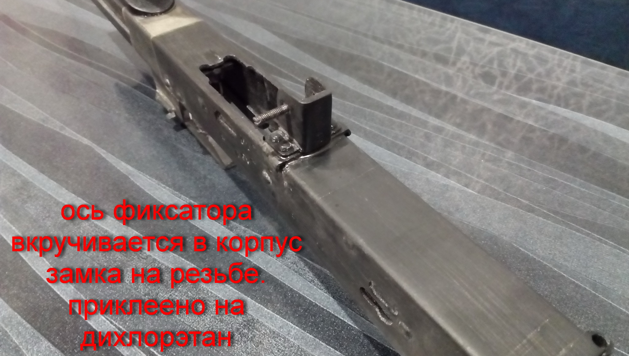 Здесь уже всё собрано в одну деталь на клею,зашпаклёвано и зачищено на стыках. Также изготовил замок магазина из листового металла. Сам копус замка приклеен к коробке,но чтобы было ещё надёжнее-скрепил винтом М4 с гайкой:
