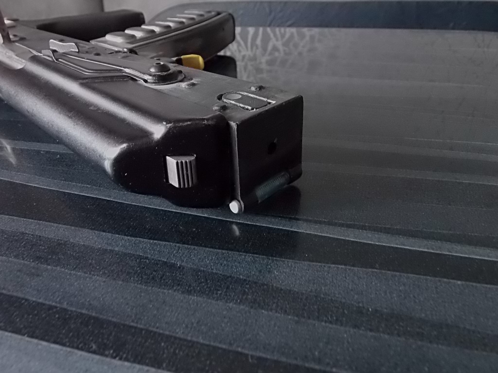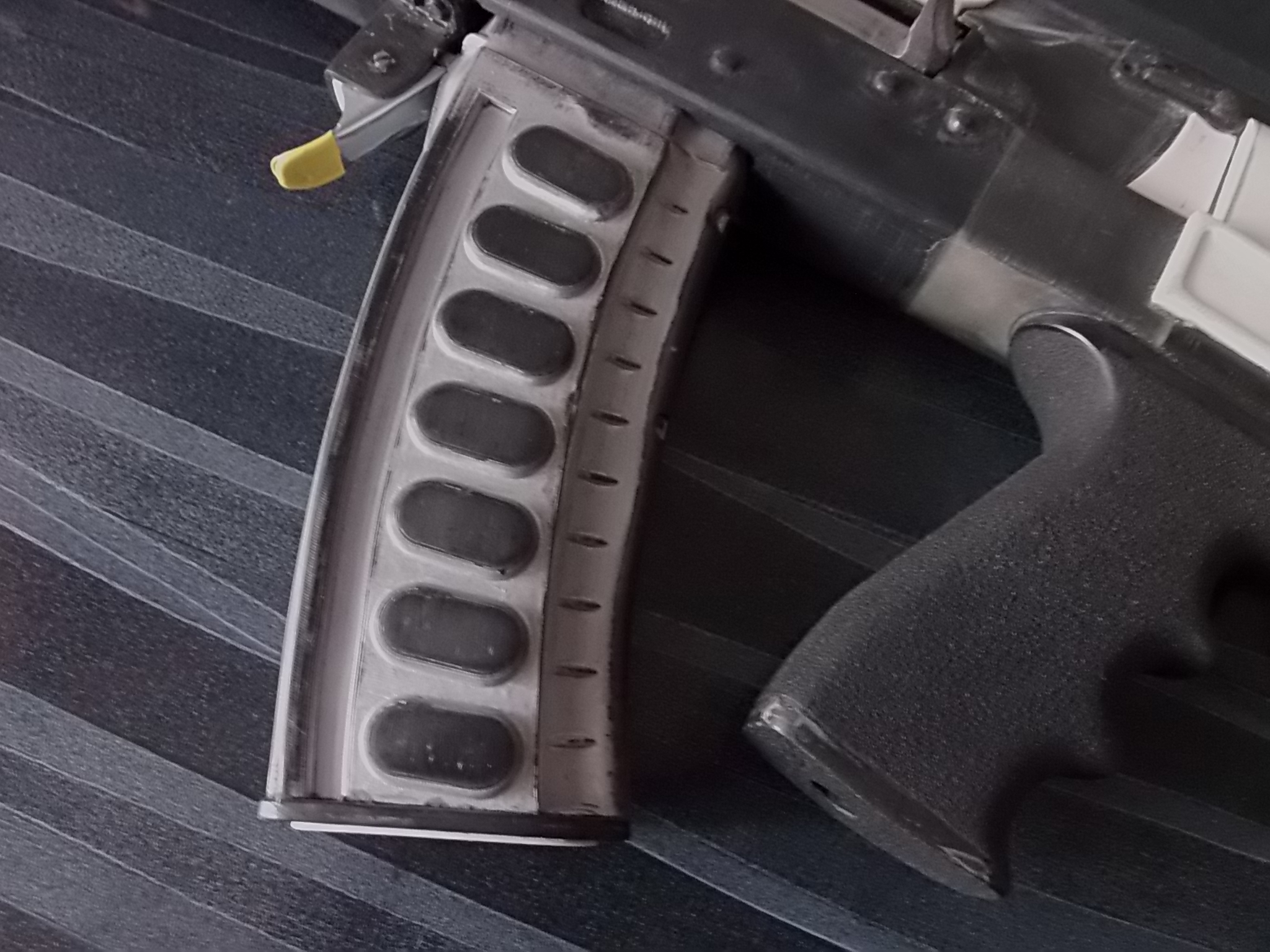 Конечно же был предусмотрен и патронный магазин. Ну точнее коробка от него. Решено было сделать его некоторым образом функциональным. Пули туда сыпать конечно не собирался,но вот расположить в нём пенал для запасного снаряжённого барабана решил. Коробка магазина была взята от АК,достал из него подаватель с пружиной и чуток отрезал от его длины снизу. Пятку магазина сделал новую из чёрного прочного пластика,а ободки из белого ПВХ пластика. Необходимо было на боковины коробки магазина сделать накладки по типу «Грозы» кал.9Х39.Под эти патроны (СП5 или СП6) именно такой красивый магазин. Пенал под запасной барабан и накладки на коробку магазина напечатал конечно дружок Руслан. Вот такой магазин вышел. Накладки приклеены на цианокрилатный клей,щелочки зашпаклевал ЭДП с метал.опилками. Уже слегка грунтовкой серой прошёлся: