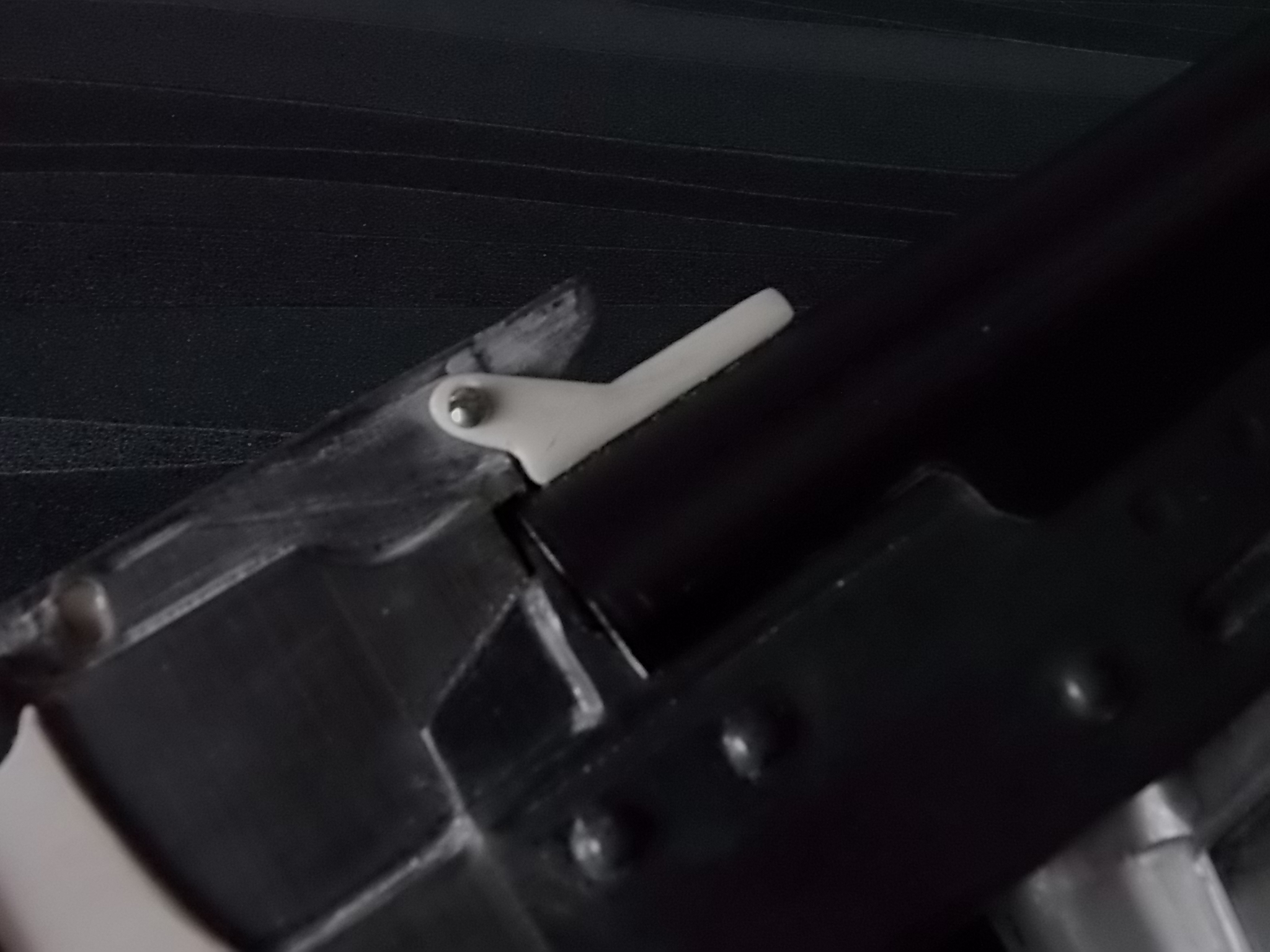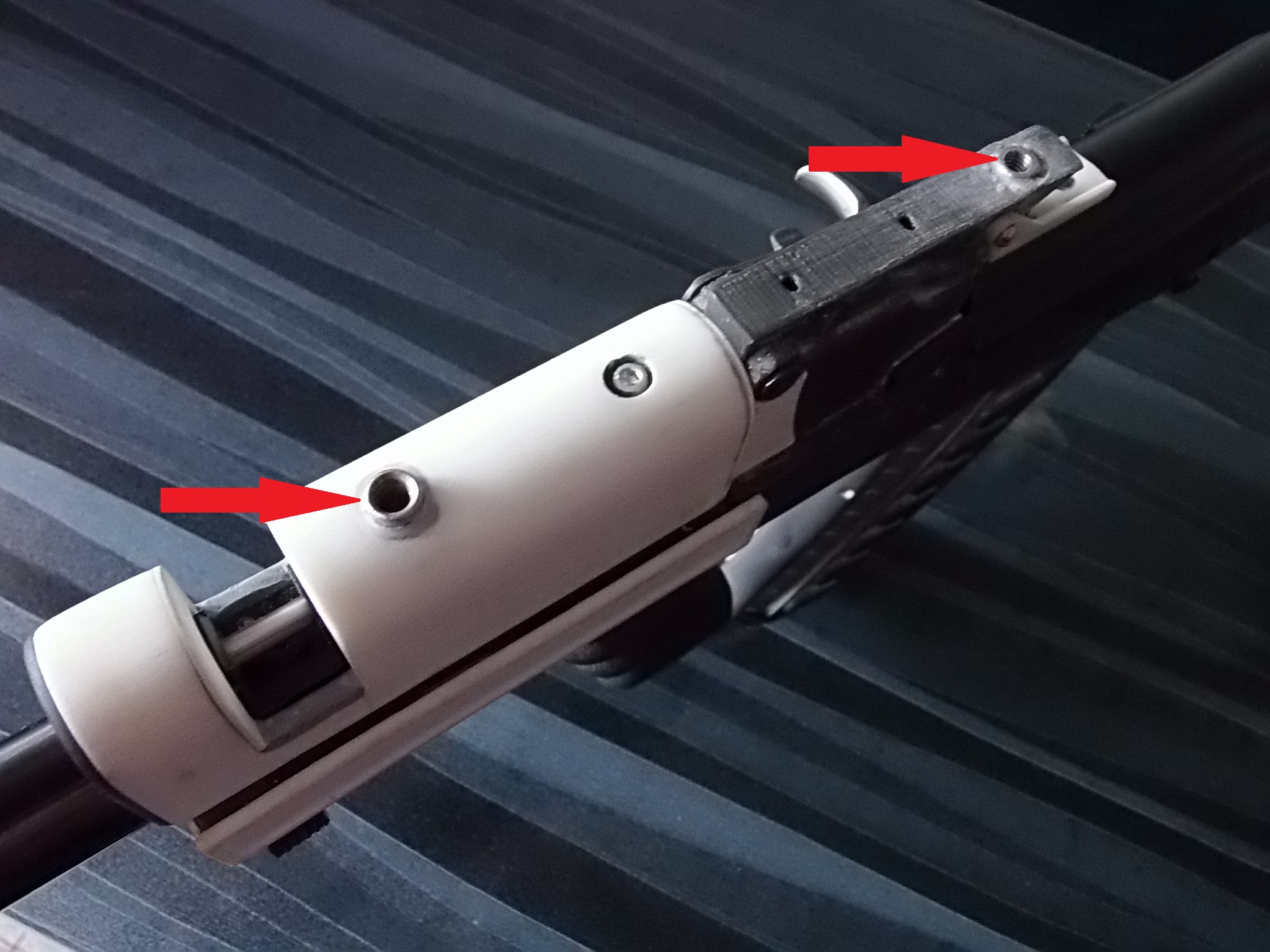 Для более надёжного крепежа крышки ствольной коробки впереди и была напечатана петля из прочного пластика. В оригинале крышка «Грозы» поднимается вверх на такой петле. У меня этого не выходила из-за угла на колодке под целик. Потому крышка моя снимается полностью с коробки. Приклеил петлю к крышке на цианокрилатный клей с метал.опилками. Затем наметил на колодке под целик отверстия в ушках петли. Снял крышку и просверлил отверстие насквозь. В него вклеил шестигранную втулку с внутренней резьбой М3. Села в отверстие она на ЭДП туго за счёт своих граней. Теперь можно одеть крышку на место,защёлкнуть её кнопкой на возвратной пружине надавив на неё сверху,а затем закрутить через ушки петли 2 крепёжных винтика во вклеенную втулку. Примерно так всё: