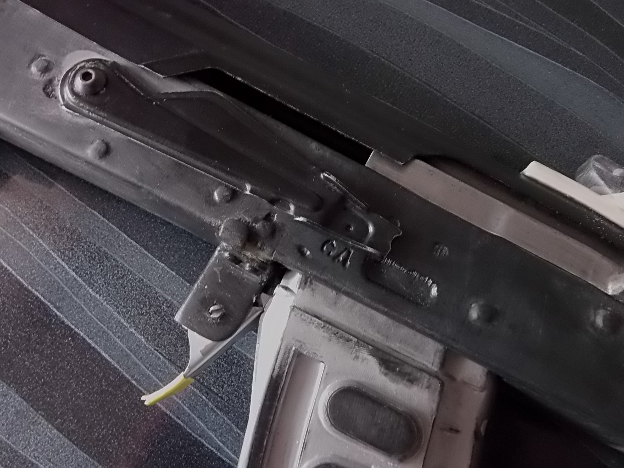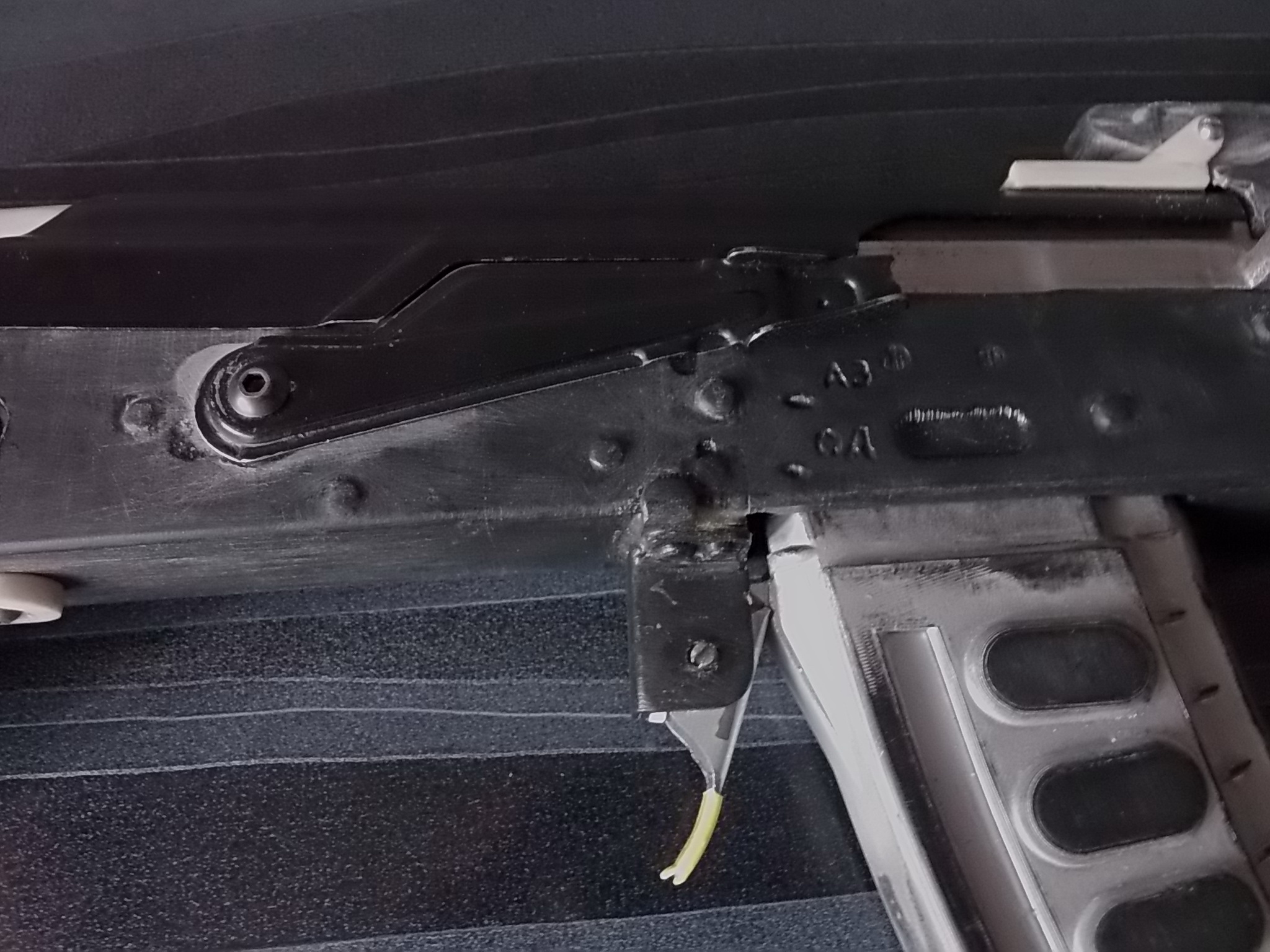 Крышка ствольной коробки была обрезана на 5мм. Тогда она становилась превосходно и фиксировалась кнопкой на боевой пружине. Также на винт закрепил переводчик огня. Он подвижен-при разборке чтобы снять затворную раму он опускается и рама беспрепятственно стягивается по направляющим назад: