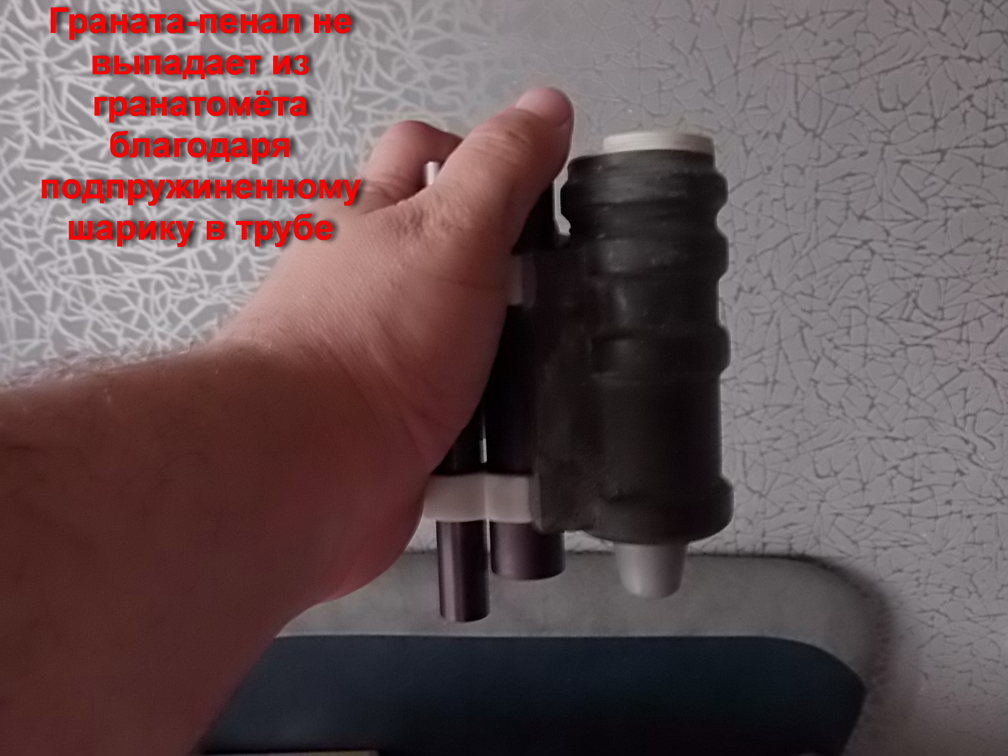 Работу с внедрением пенала в магазин отложил на время. Пока мудрил это,был мне прислан напечатанный к этому времени корпус подствольного гранатомёта и некоторое подобие гранаты для него ВОГ25П. Решено было сделать и эту «гранату» с определённым функционалом! А именно она должна была стать пеналом для запасного баллончика с кислотой! Чего ей просто так торчать в гранатомёте? Пусть хоть что-то полезное будет в ней!Верно? На «гранате» были сделаны типа нарезов элементы. Внутри корпуса гранатомёта также ответные нарезы. Т.е. граната-пенал вставлялась и извлекалась из трубы гранатомёта по направляющим «нарезам». Обрабатывал напечатанное как обычно-зачистка,шпаклевание,зачистка. Позже «гранату» окрасил после грунтования,придав ей некоторую состаренность пошаркав по ней 2000-0й наждачкой. Чтобы граната эта надёжно крепилась-в трубе гранатомёта вклеил подпружиненный шарик. В гранате также сделал углубление под этот шарик. В итоге-вставляем в задницу гранаты запасной баллончик,по отмеченному нарезу толкаем гранату в подствольник до щелчка! Щёлкнуло-значит граната в трубе зафиксирована. Она не выпадает оттуда,углубление под баллончик расчитано точно и в диаметре,и по длине. Никакого дребезга и шата ни гранаты,ни баллончика! Для надёжности вклеил внутрь гранатомёта мощную пружинку. Вышло всё как хотелось:
