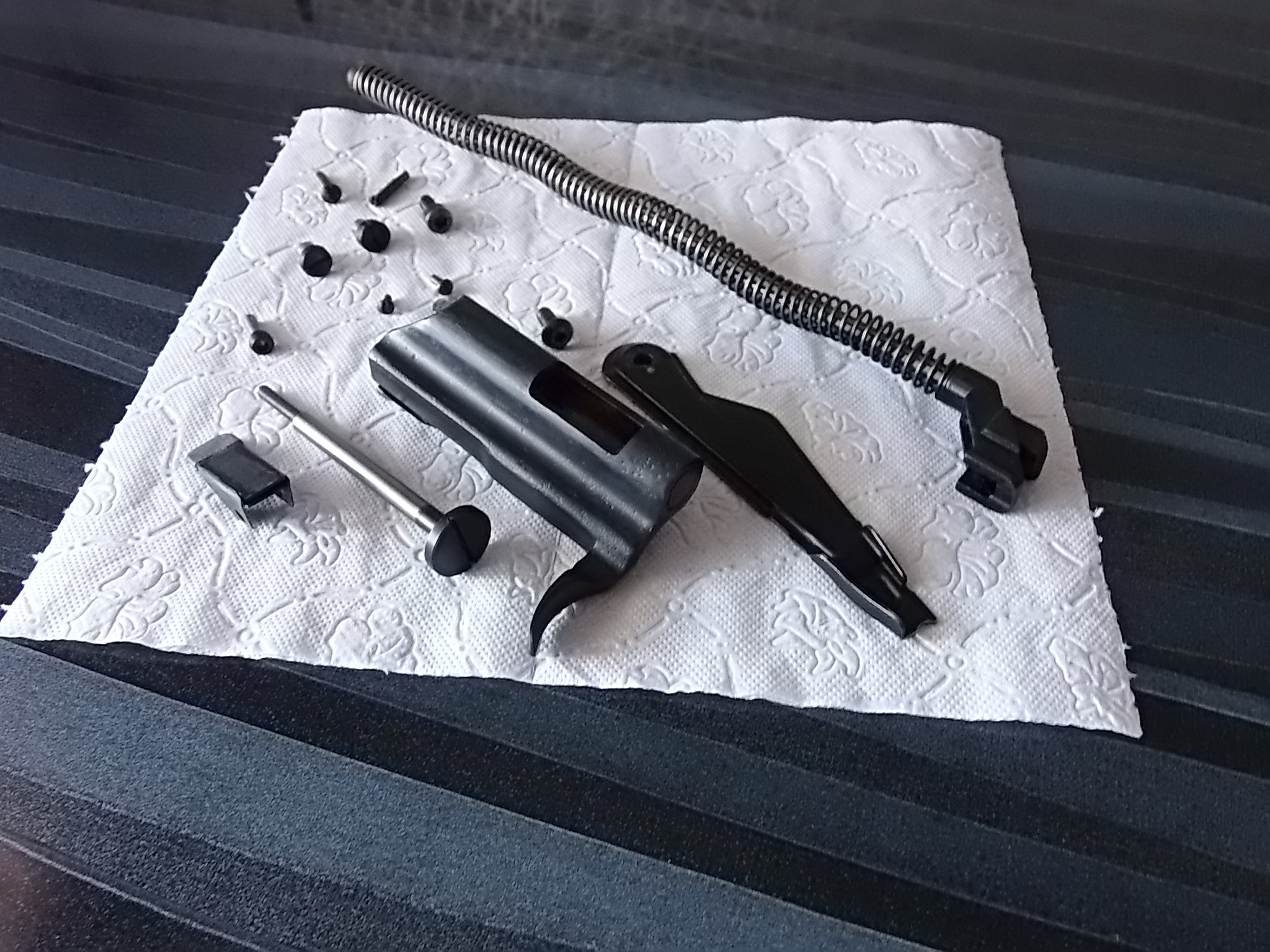 Теперь можно было взяться за железки и подворонить кое-где. Заворонил «Клевером» затворную раму,головку длинного крепёжного винта и головки маленьких винтиков крепежа в петле на крышке коробки,головку винтика крепящего крышку на пистолете,на возвратной боевой пружине зачернил кнопку и головку самореза крепящего кронштейн с затыльником снизу. Винт под шестигранник крепящий ствол заворонить не удалось-он зараза из нержавейки оказался. Финский-он от их оборудования «NEXTROM». Ну да ладно-подберу другой,не катастрофа-есть вроде в заначке у меня такие длинные чёрные «пятёрочки» под шестигранник. Также зачернил головки винтов М6 которые будут сверху крепить планку «Вивер». Ну и само собой экстрактор магазина патронного вместе с осью резьбовой. Переводчик огня и винтик под него были с приятными потёртостями-их оставил в том же виде. Будут антуражнее выглядеть на изделии. Вышло так: