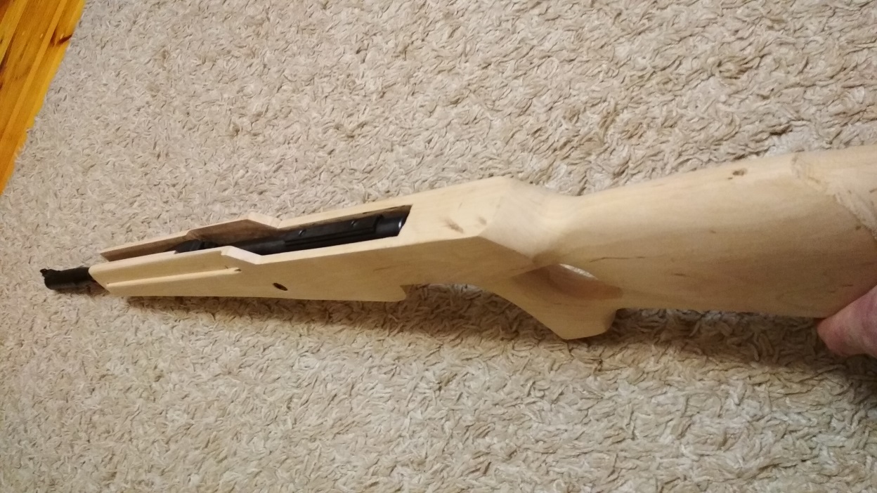 Ложе делал с отводами пятки и носка из березы, красил морилкой и пропитывал льняным маслом. Крепление железа через металлические футорки. Внутри приклада отверстия со свинцовыми вставками для баланса.