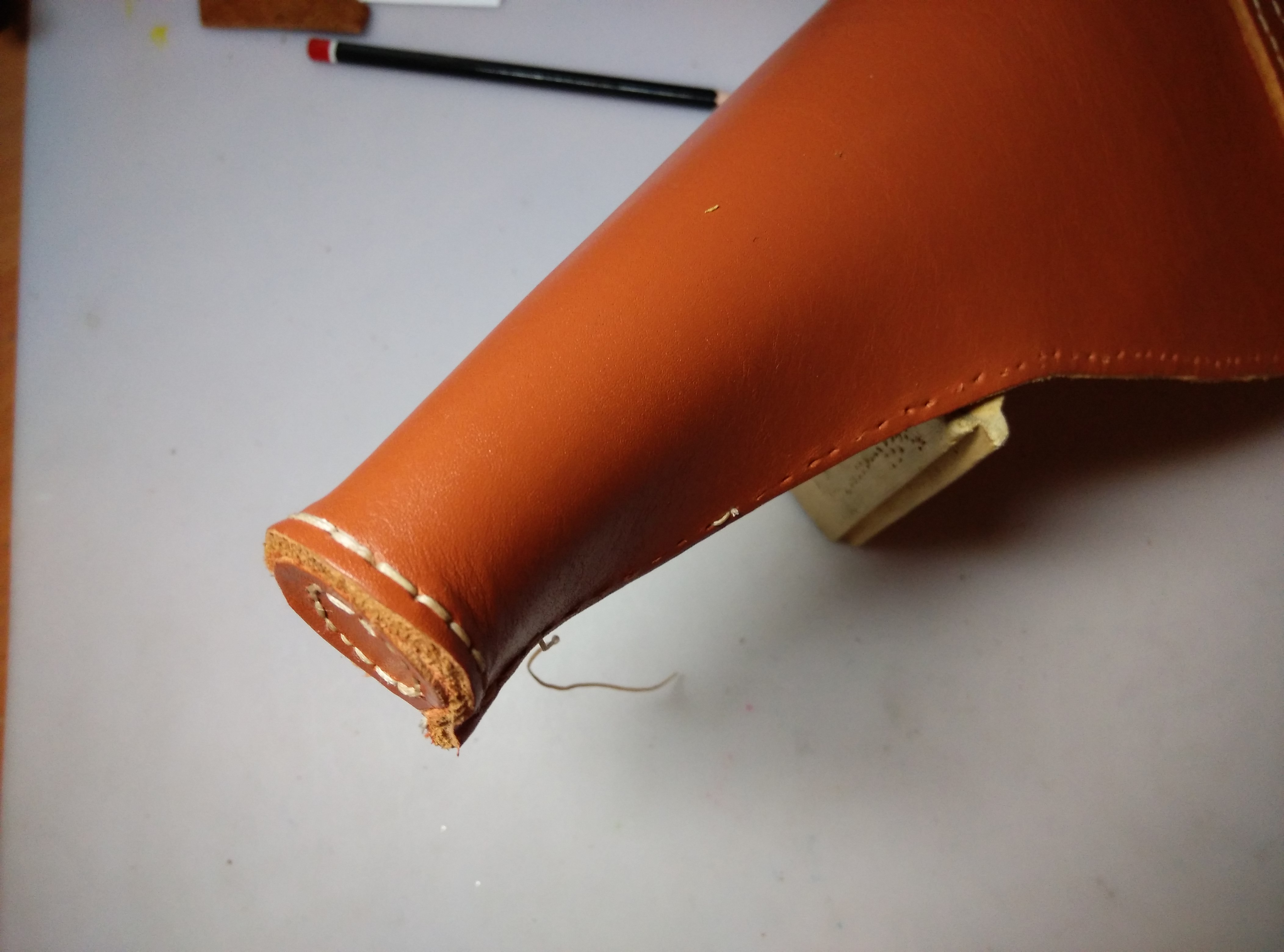 Когда все мелкие детали были пришиты, уже по готовым отверстиям кобура прошита окончательно. Если кому не понятно как шьется - поясню.Одна нитка с иголками на двух концах, или отдельные нитки с иглами, по необходимости. Шьется навстречу через стяжок. Одна нитка идет по верхней стороне, вторая по нижней, на следующем отверстии, они меняются местами. Профессионалы пользуются крючком, тогда одну нитку цепляют крючком, вытягивают на обратную сторону петлю, продевают в нее нитку, а потом с равным усилием затягивают обе нити. Тогда обе части стягиваются между собой как бы внутри шва. Это конечно самый правильный способ. Так войлок шьют, но он толще, с кожей не всегда так получается, конечно, если нет профессиональной швейной машины, или друга скорняка.
