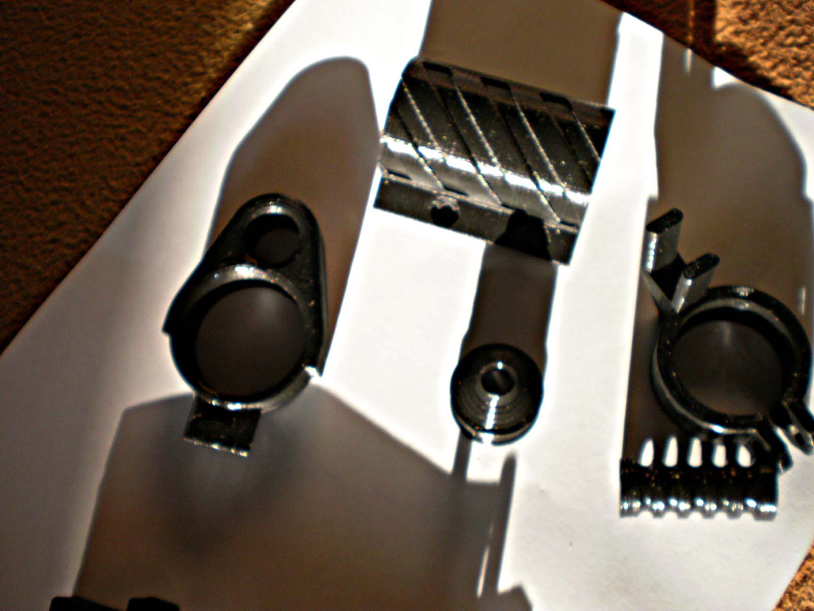Так же есть восьмерки - копии штатных (резинки вставляются самостоятельно), гравимагазины коробчатые под кубик-папу на 5 и 10, хомуты, проставки под планки на ложе... короче всякого хватает.