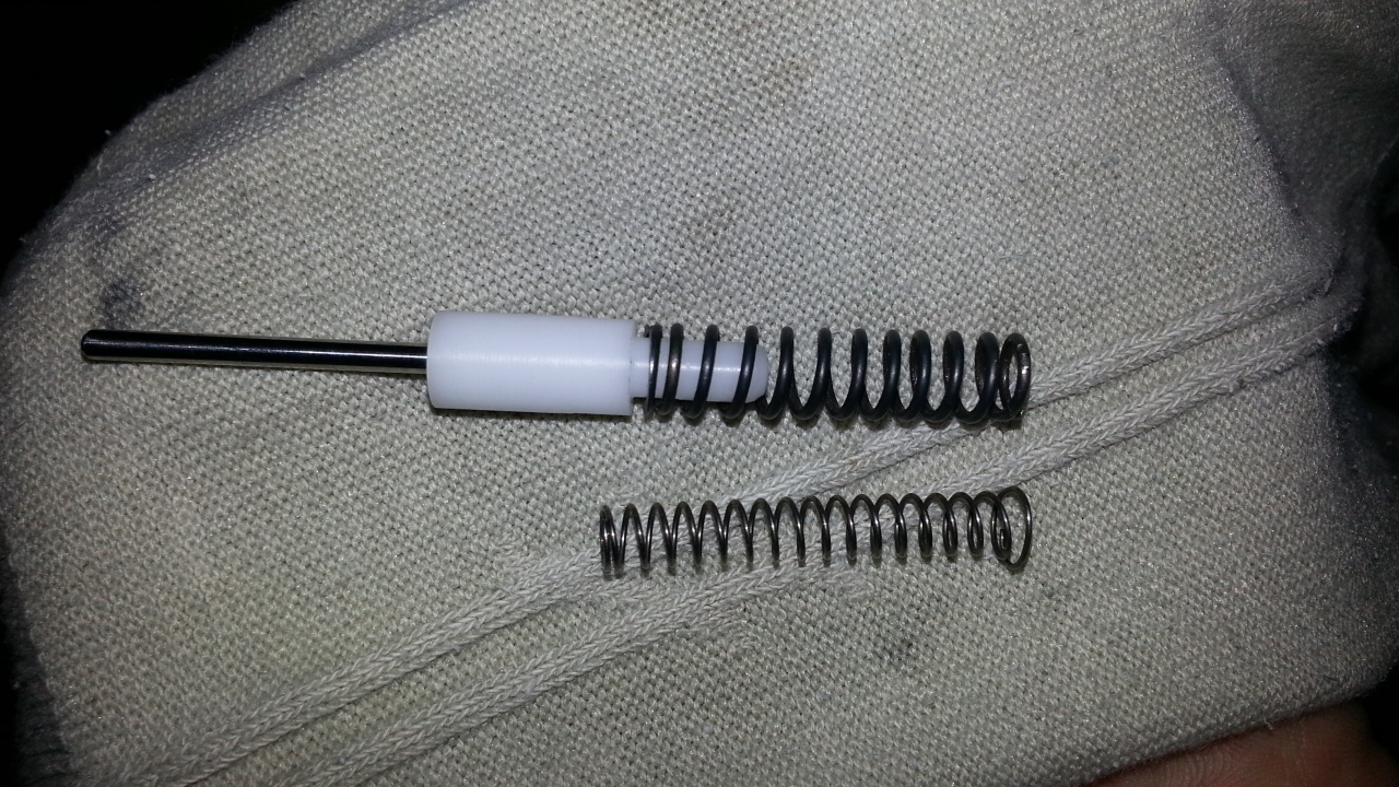 У меня стоит средняя пружинка, легко продавливаемая пальцем, но могу поставить от шариковой ручки...