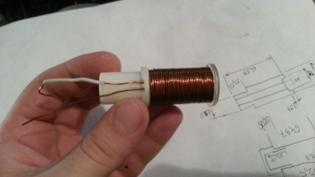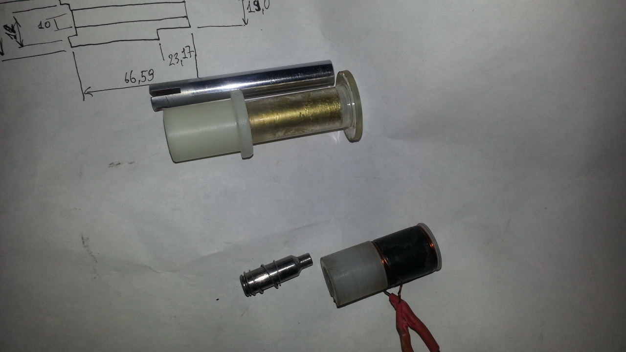 Как Андрюха и советовал, нашел я проволку 0,8 и сделал 4-ре ряда. Само тело и стержень соленоида, скомпоновал из частей некого крупного заводского соленоида - там и сталь как надо, и бронзовая гильза под стержень, и стержень большего диаметра.