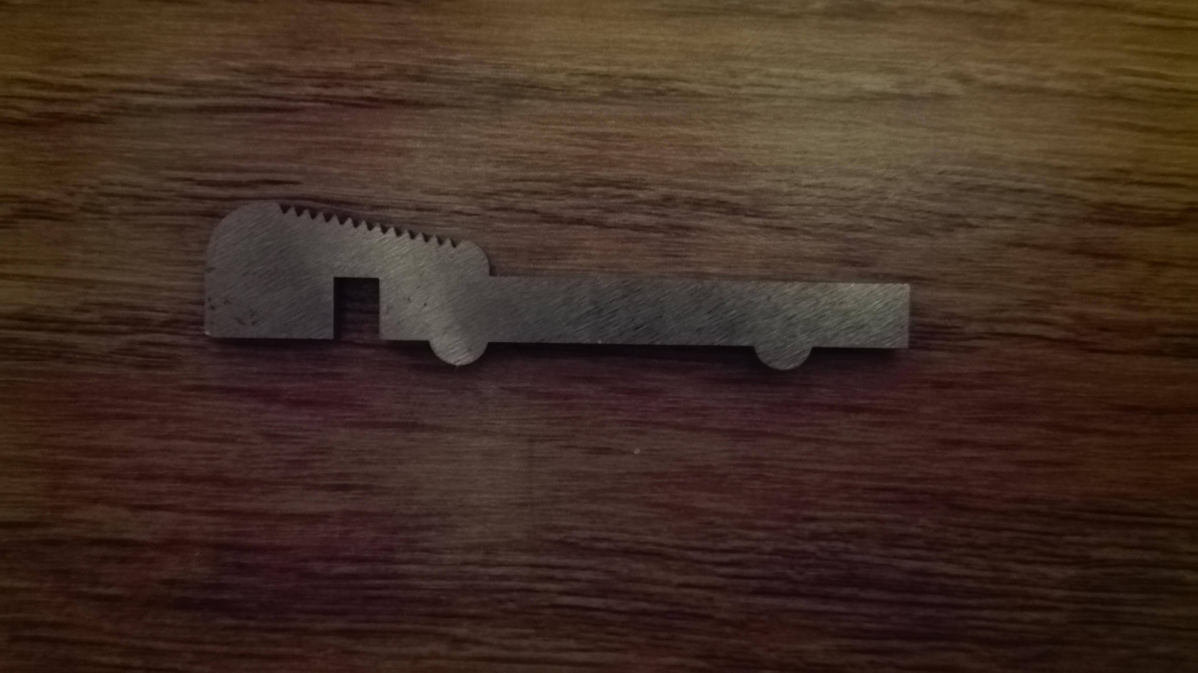 Заготовка резалась на проволочном оборудовании. Осталось сделать нужный угол (по месту), отверстие и по желанию закалить.