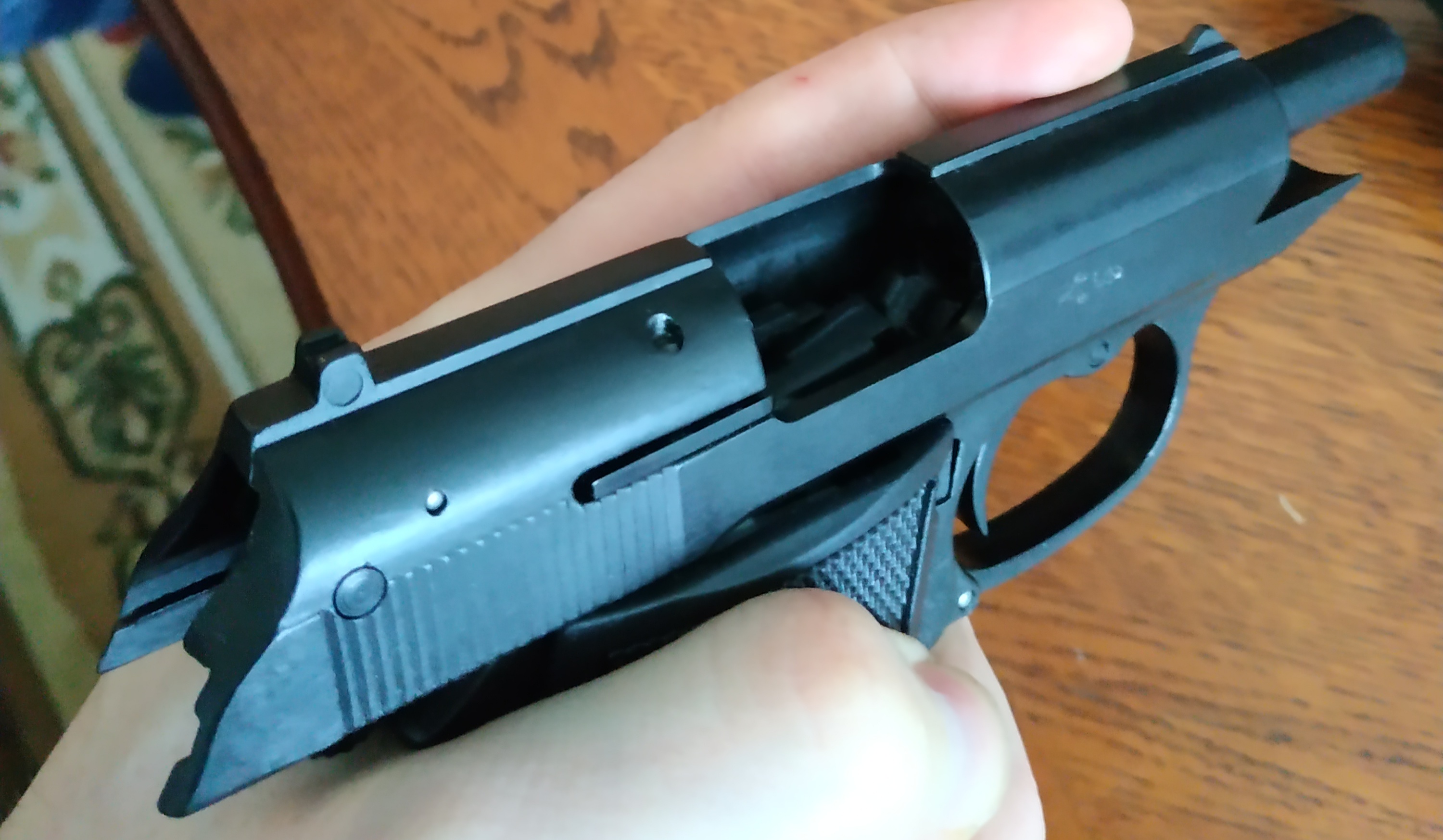1. Стреляет сигнальный пистолет Walther PPK в полуавтоматическом режиме, т.е. после выстрела выбрасывается отработанный патрон, а затем новый патрон - за счет движения завторной рамки - заряжается из магазина в патронник. После выстрела последнего патрона, на затворную задержку не становится (отсутствует). Есть в Сталкере