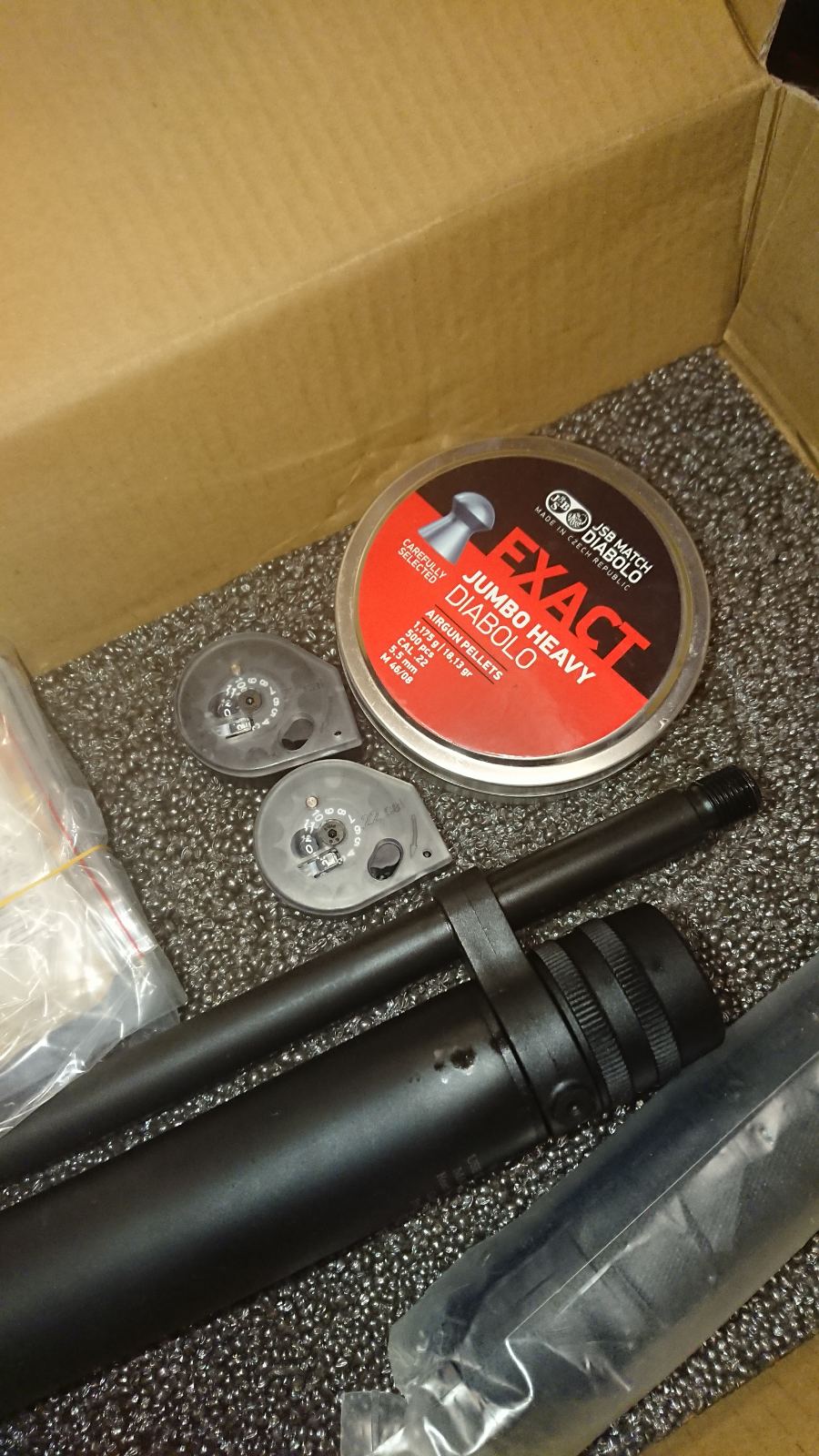 В комплекте коробка, доки, сертификаты, 2 барабашки, лоток для штучной подачи, модер, ЗИП, штуцер, банка JSB(1,175)