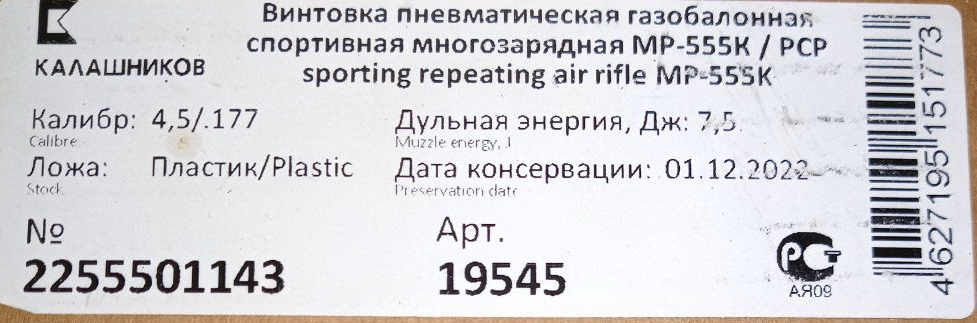 Re: Продам PCP винтовку МР-555К. Гомель.