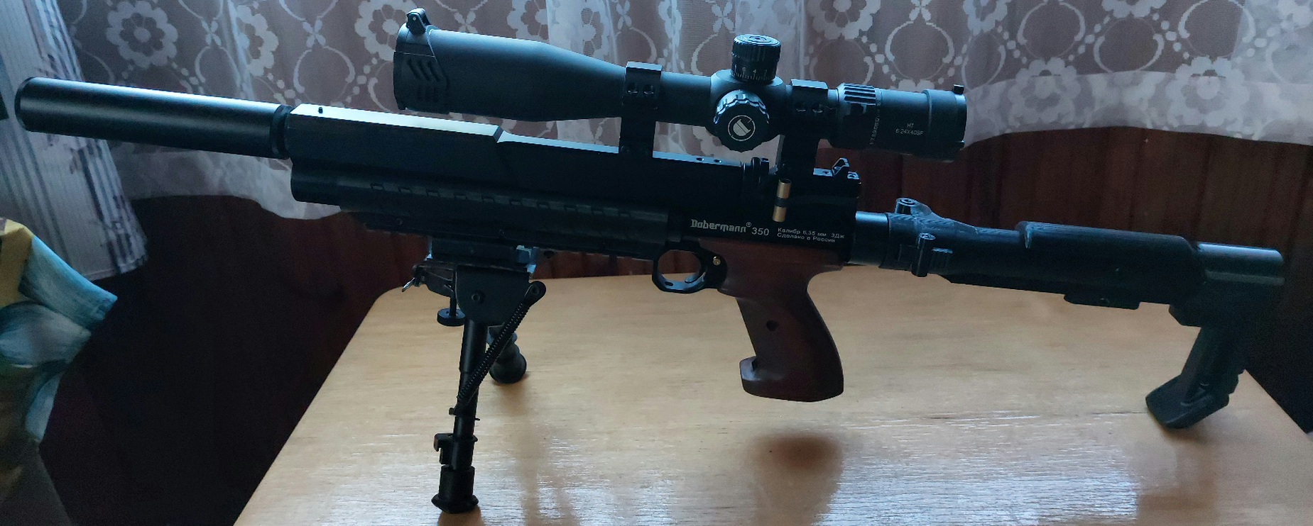 Установлен складной с регулируемой щекой приклад, цевьё с сошками, кастомная деревянная рукоять (заводская в комплекте), оптика DISCOVERY 6-24x40 ffp.