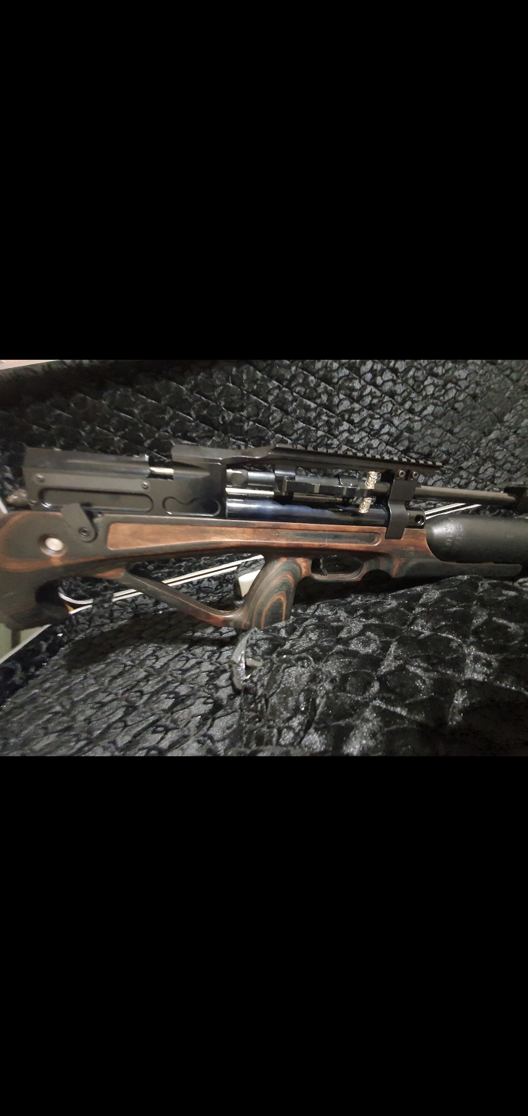 Кастомизированное ложе-дополнительно морилось и укрывалось несколькими слоями масла -для достижения эффекта и фактуры ЛАМИНАТА в матовом исполнении...при желанти можно сделать стеклянный глянец облив Hard лаком.Далее по ложе установлен вырезанный и фрезерованный под заказ тыльник из Микарты...установленна планка под колбой для крепления сожек и доп.оборудования...изготовленный под заказ железный спусковой Крючок (заводской в комплекте )