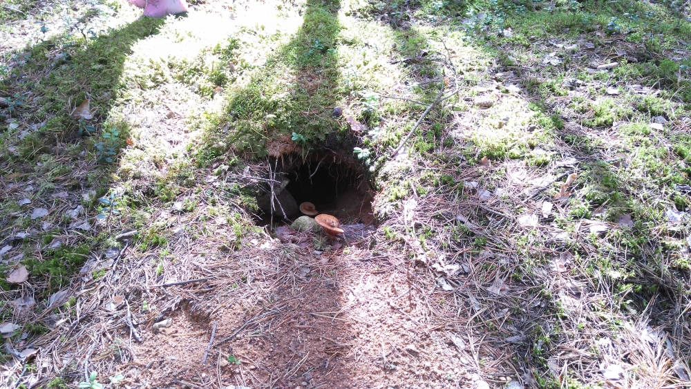 Показав жене несколько воронок оставшихся со временем по войны, обнаружил брошенную лисью нору, а может она на моря укотила в отпуск, кто не знает. На входе росли две кобылки, но трогать я их не стал, хоть и не охотник, но оставлять там дух человечий не хотел, а вдруг там лисята или ещё по какой причине она потом не захочет войти в своё же жилище. Вообщем прошел мимо.
