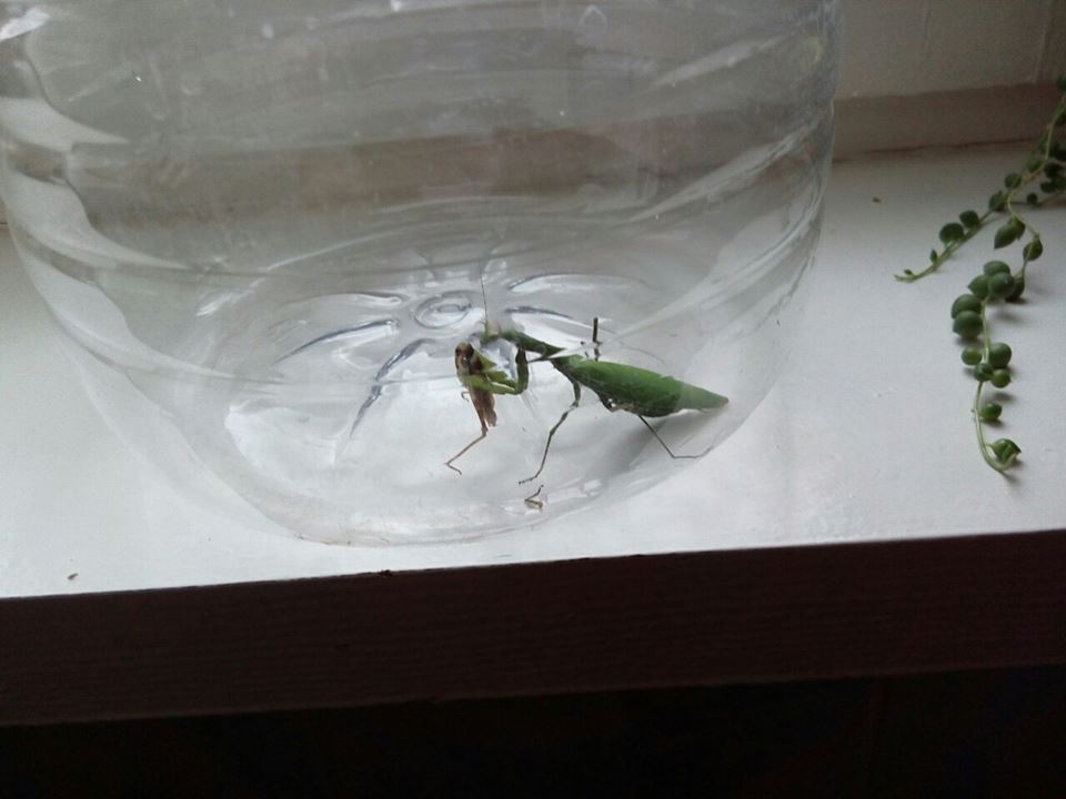 Сын поймал богомола! :sh_ok: Вопрос- теперь эти животные живут у нас? Артем его кормит второй день кузнечиками, думаю ему хорошо в неволе.