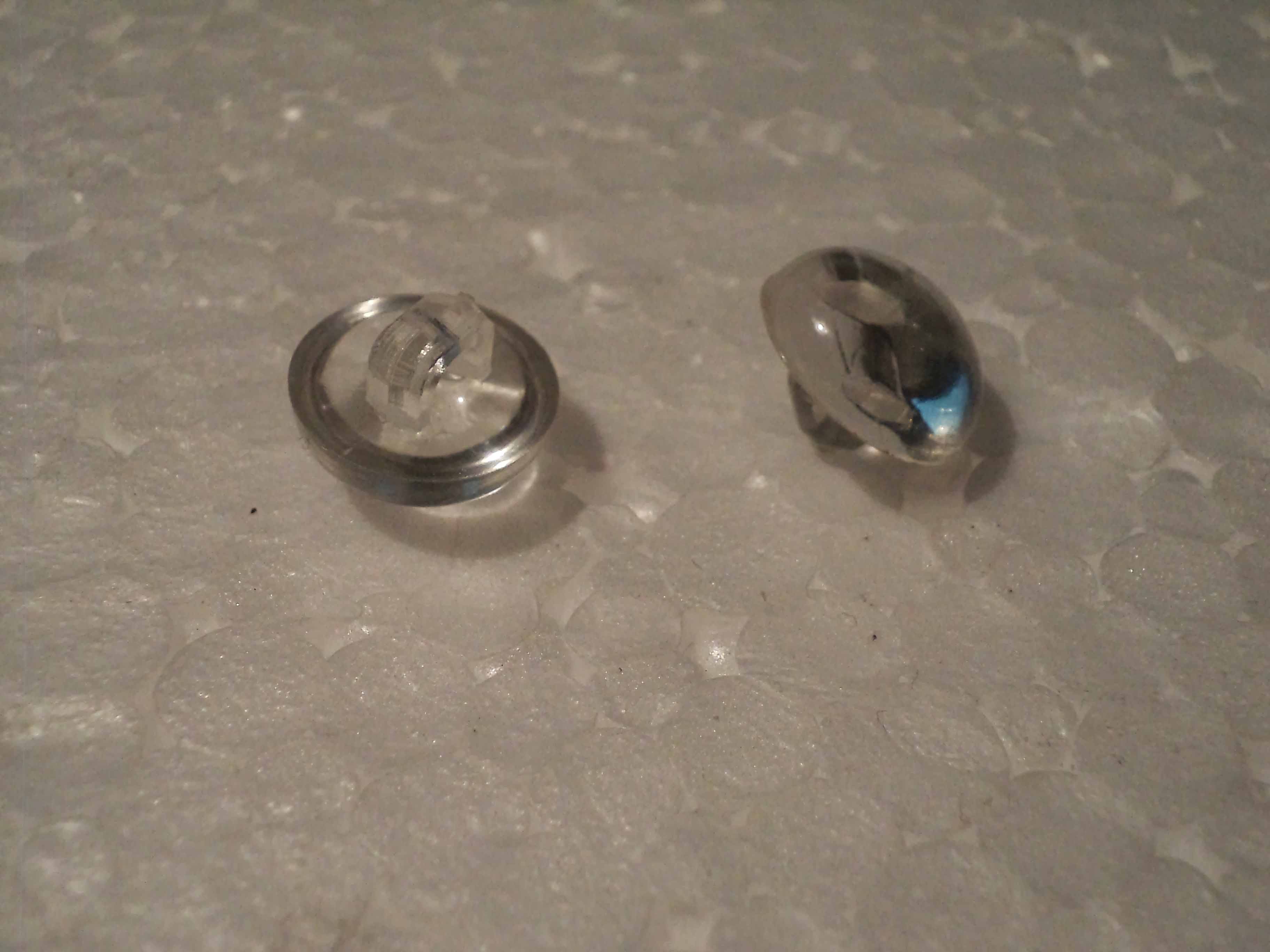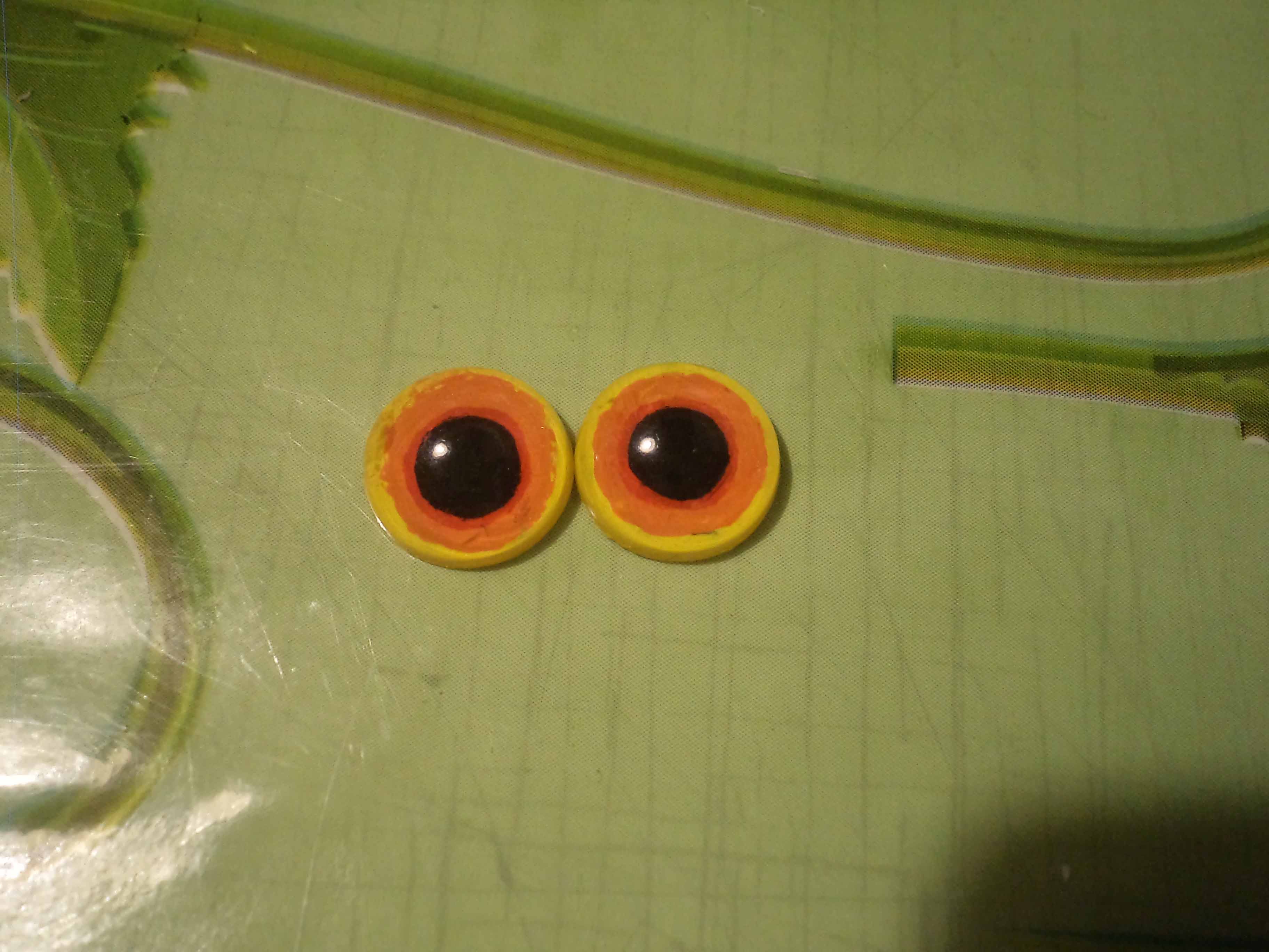 ...вернуться хочу к глазам... сейчас глаза на фирмах дорогие да и со временем тускнеют на свету...вот хочу опять поднять эту тему...на конец сезона по птице решил улучшить глаза - использую те же полусферические пуговицы...стачиваю ушко под нить, ставлю по центру кЕрновую точку ножом, и потом сверлами 3 и 5 мм углубляю на 1.5-2 мм, краской акриловой по краю углубления (зрачок) на ширину около 1 мм делаю по кругу полоску, сушу, затем такую же, но шириной около 2 мм - оранжевой и остальную плоскость - желтой, ну вообщем получилось вот так...