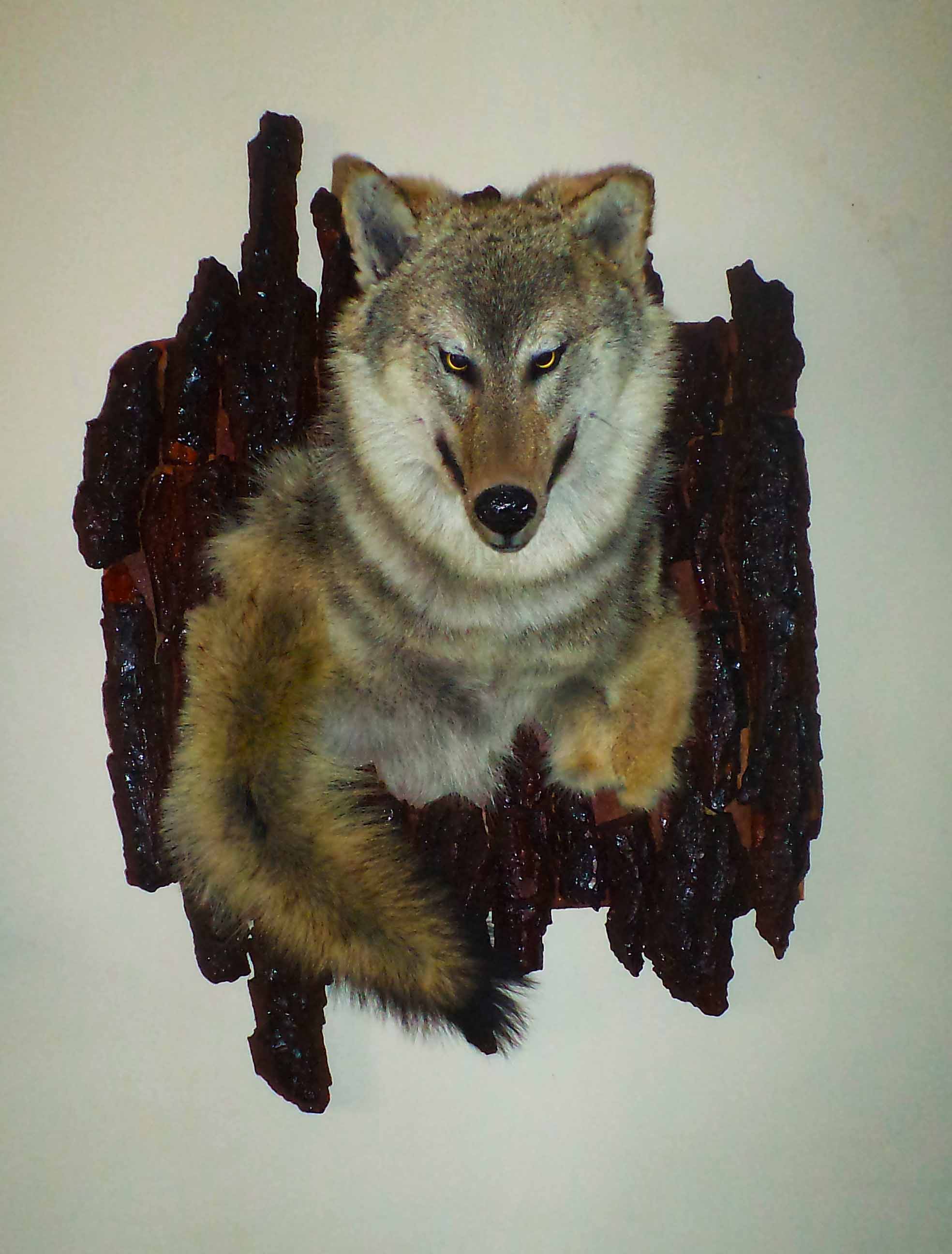 ...представлю свою первую волчицу..... стреляна она в декабре 2016 года начинающим охотником из с.Вербовое восточная часть района, ружем Cobalt SA28 12k между Чингульской и Терешковской балкой вблизи села,... увидели стаю случайно, "влет" собрались, местные охотники следили 4-5 голов по снегу от села, там на ее окраине волки ушли в балку, а дальше гнали их с трех сторон на машинах, пытались догнать и отстрелять, но добыли только молодую самку 2-х летку, остальные ушли (ш-47.40230711784592...д-35.94798226564854),... стрелял молодой стрелок раза четыре "8.2" или "трио",.... два в грудь и два в бок (вродь так), долго искали других, но по пустому .......потом туша пролежала у стрелка в гараже около трех дней при 0...-5 градусах, не знал чего с ней делать.... и в итоге на половину испортилась - при снятии пошел запах и шкура от зада до груди уже была в зеленой гнили....пришлось отрезать выше груди и морочить ее дальше... в итоге такой образец и получился....