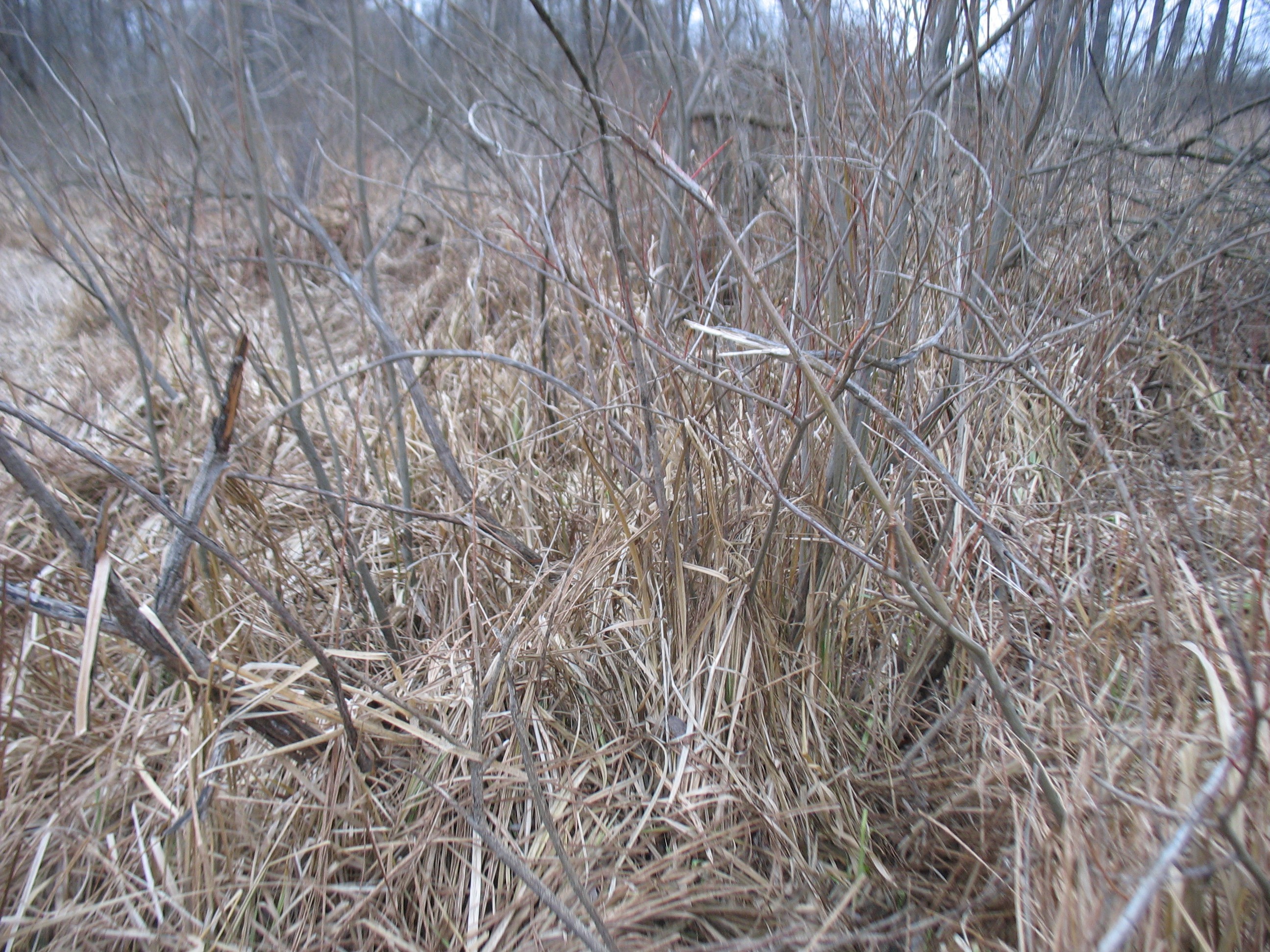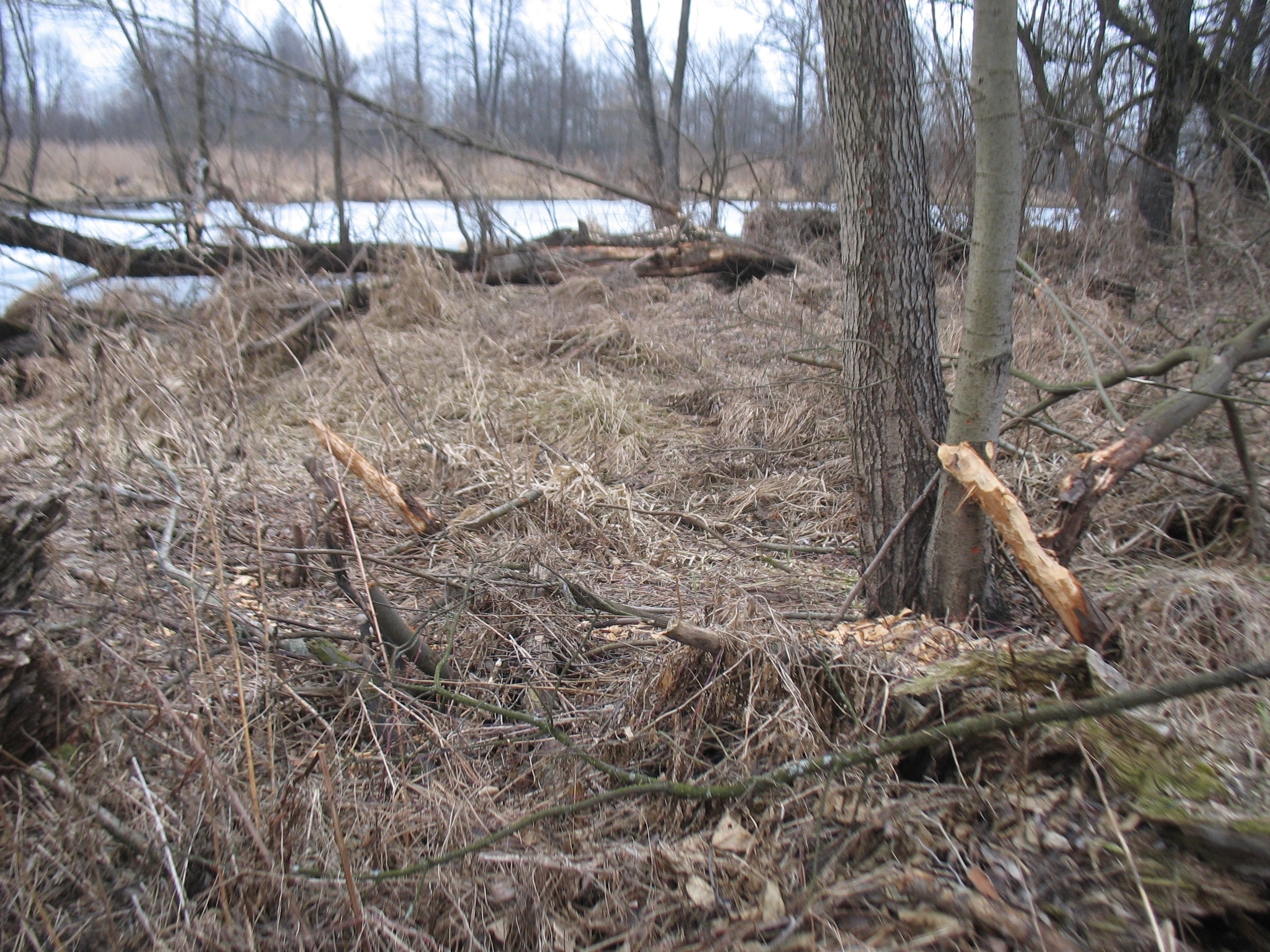 На краю леса растёт лозняк. В середине его на высоте примерно до колена порезаны ветки толщиной с палец(плюс-минус),только палки торчат из земли. И этим лозняком на земле выложена перина примерно 10х10м,толщиной местами доходящая до метра. А вокруг всё перепахано...