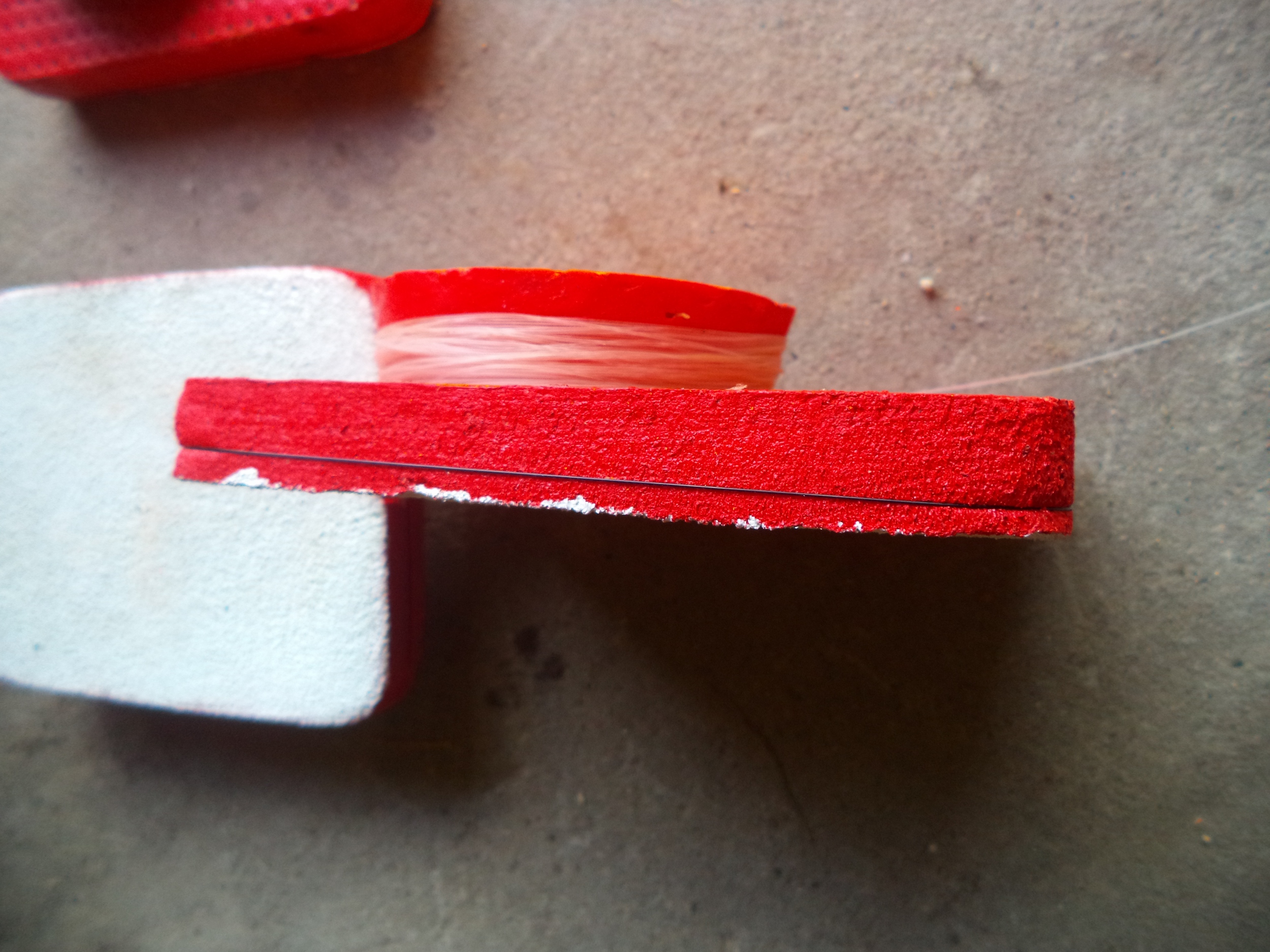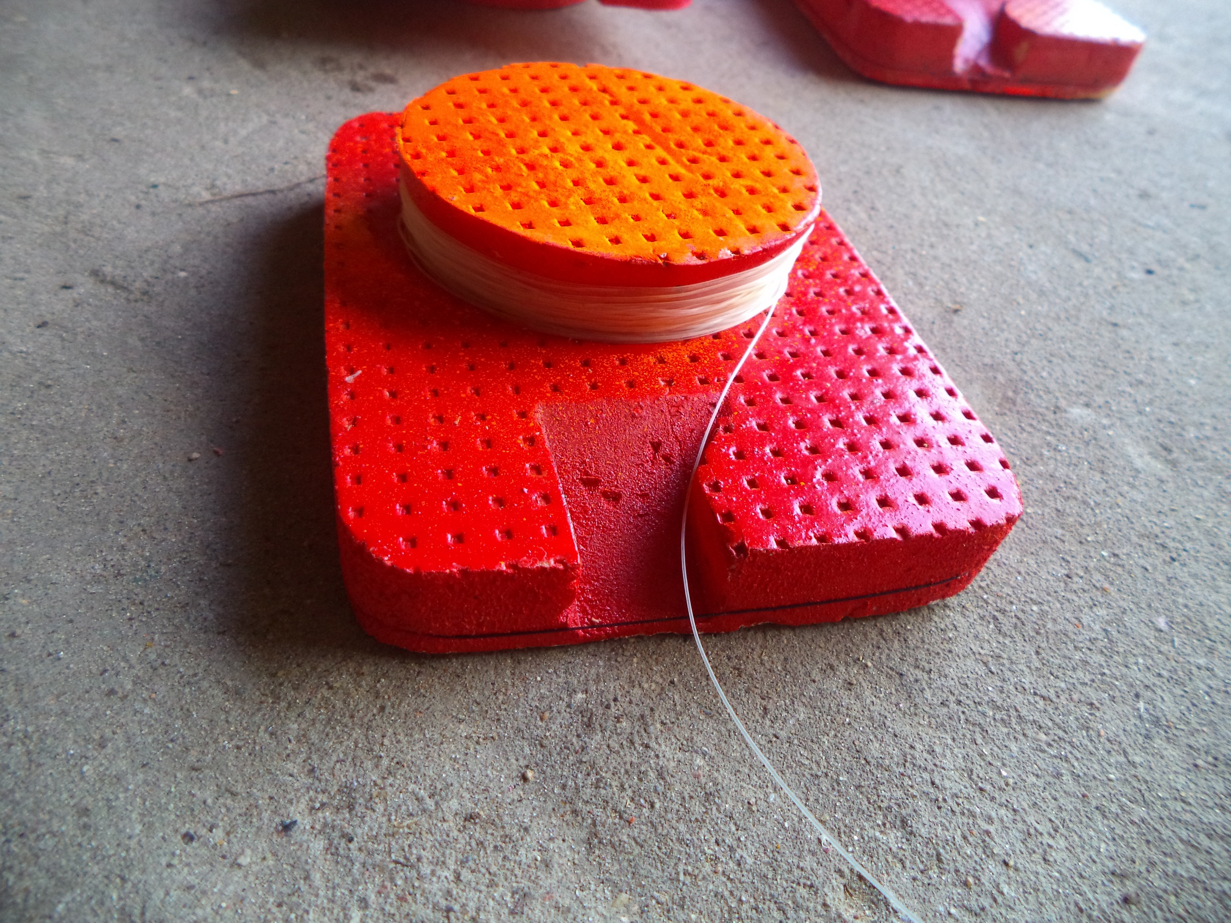. Исрользовал твёрдый полистирол для утепления зданий. Раскалённой струной распускал лист, чтобы получилась толщина 1,5 см. Далее вырезал прямоугольники размером 100х130 мм. Кружок для намотки лески вырезал отдельно, а затем посадил на клей "Титан" (для потолочных плинтусов). Кружок нужно вырезать немного под конус, чтобы при транспортировке леска не слетала кольцами. При поклёвке кружок переворачивается и леска сходит с кружка наподобие как с безынерционной катушки. Низ окрасил в белый цвет - при поклёвке он очень хорошо заметен на расстоянии в любую погоду. По кругу прямоугольник обтянул леской - это для прочности, чтобы крупная щука при резкой потяжке не перерезала кружок, за эту леску привязываю основную.