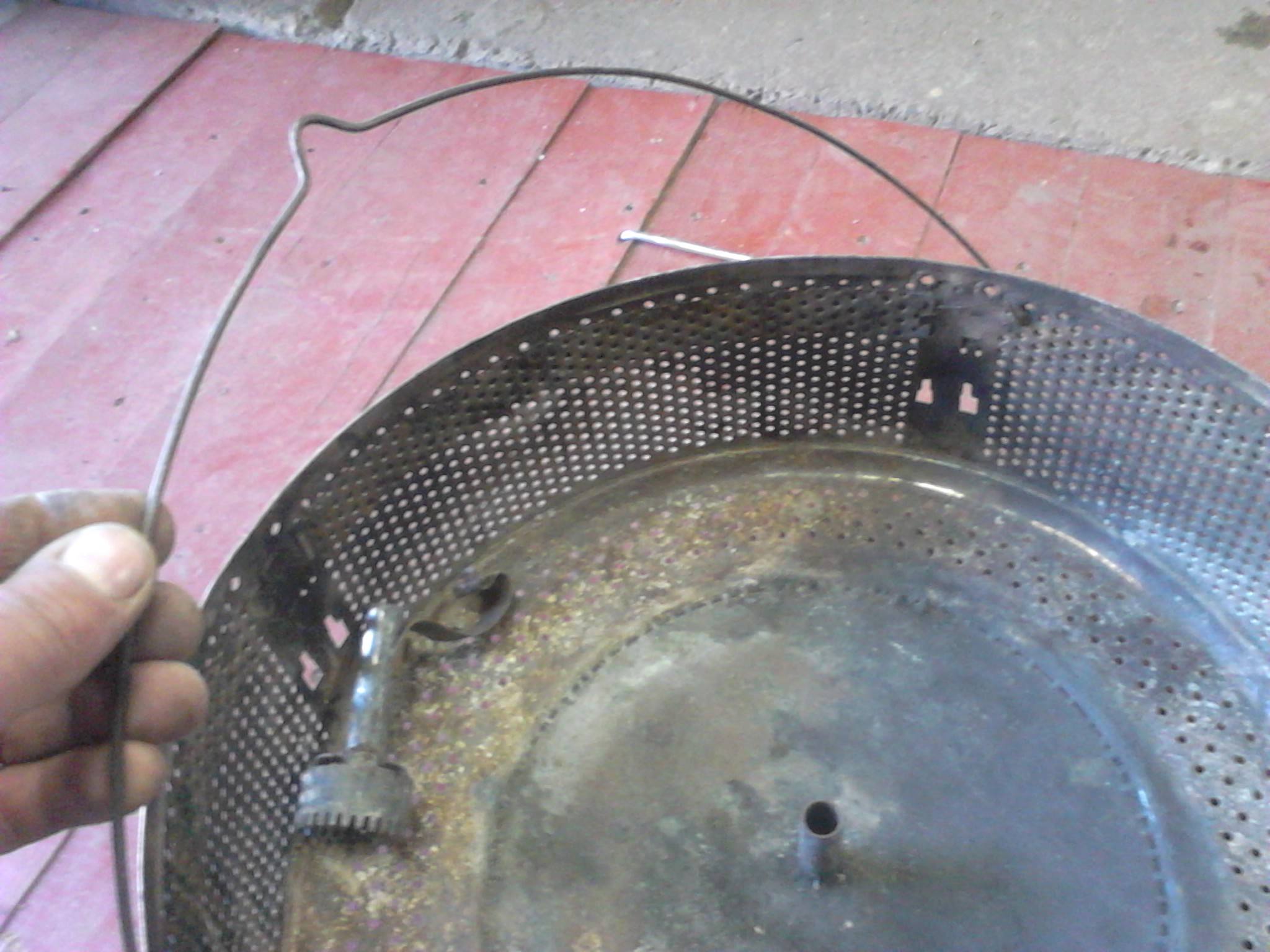 Разобрал. Достал барабан. Легенькая и "приятная" 0.5 нержавейка. Отрезал все лишнее. По торцу отпиливая "дно" резал электролобзиком с пилкой по металлу. Оказалось вдоль буртика по кругу им работать довольно удобно, хотя и грохота от него.... По кругу по диаметру барабана проведя маркером попилил балгаркой.