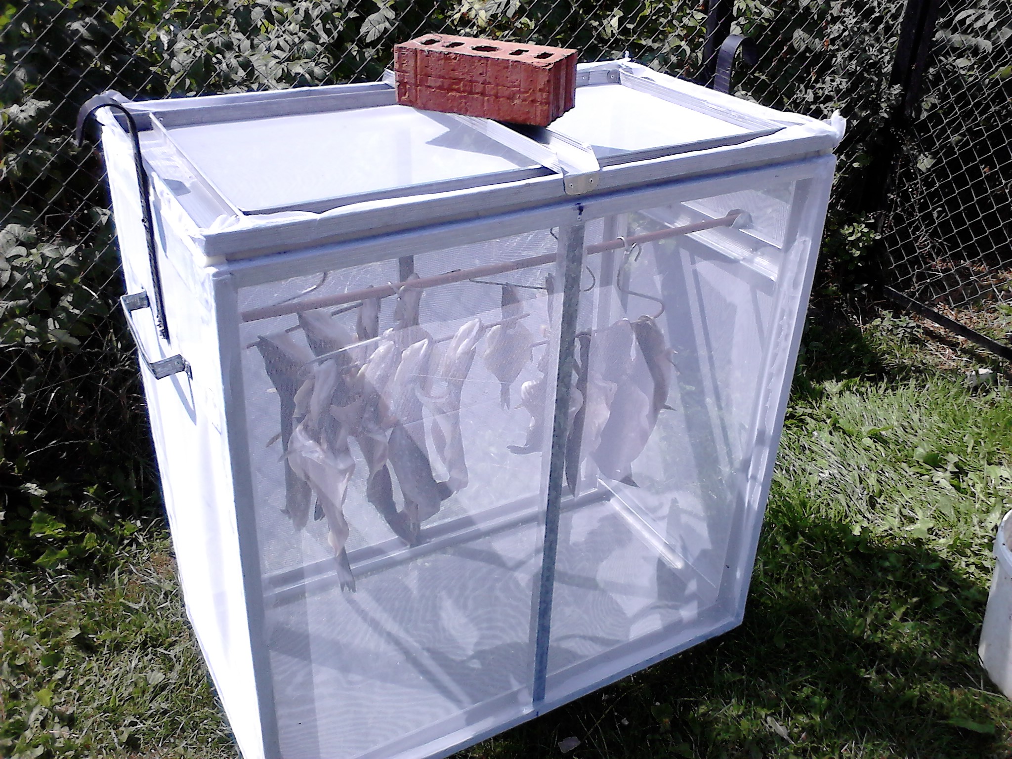 Вторая сушилка ждет своей очереди. Она сделана в виде фанерного пенала и в нее вставляется тепловентилятор, когда с рыбы перестанет стекать жидкость перекину в нее. Рыба в потоке теплого воздуха высыхает до готовности за часа 3-4. Потом сфоткаю и ее.