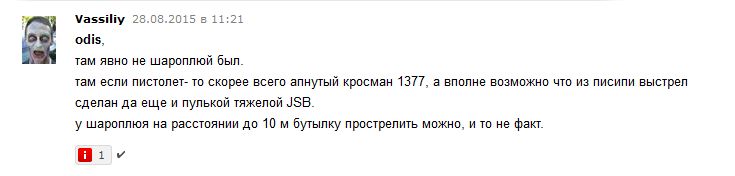 пенсионер72 писал(а):Такими темпами с участием СМИ скоро мы получим в плечи запрет на все виды пневматики без разбору до 3-х желудей и выше, по крайней мере все к этому идет (онлайнер ссссука постоянно подливает масла в огонек, как будто главному редактору кто-то в детстве из воздушки в задницу попал), скоро мы не только по пустырям будем ныкаться, а выезжать в соседние страны для пострелух и плинка по бутылкам. А стрелку пидору я лично из его собственного пистолета отверстий бы наделал в труднодоступных местах. Одно непонятно с какого шароплюя он мог так стекло рассадить (стекло кстати около 4 мм), ведь учитывая ширину полос движения около 3 м, плюс тротуар и прилегающую к зданию общаги территорию до тролейбуса должно быть не менее 25 - 30 метров (загадка мля однако