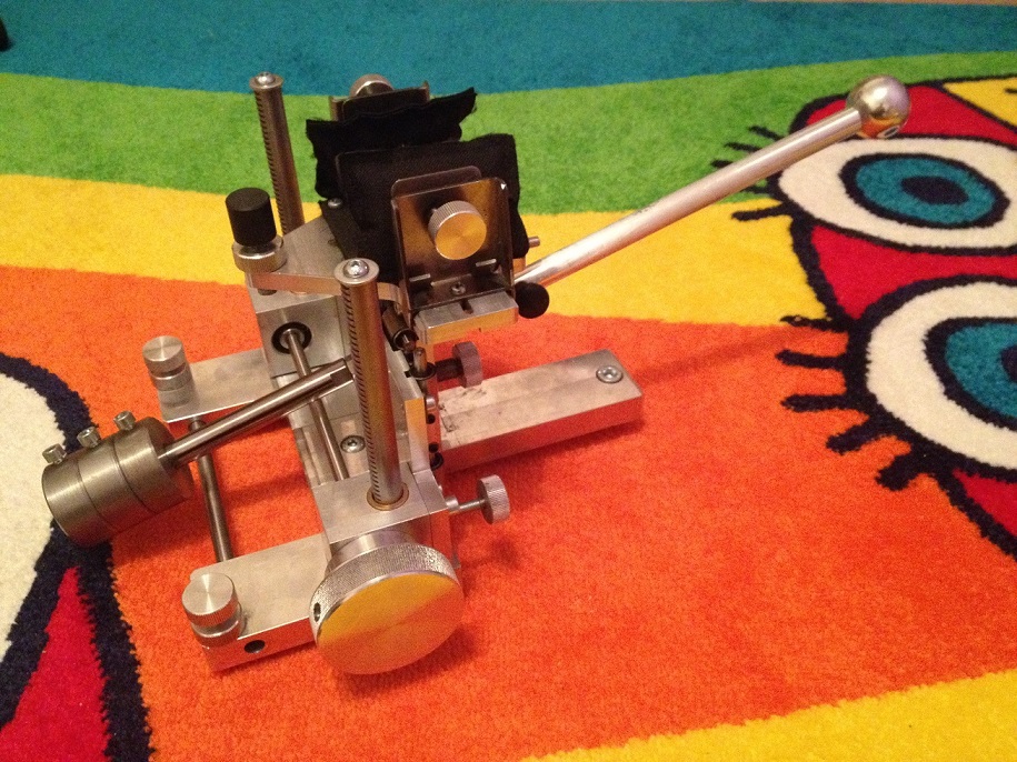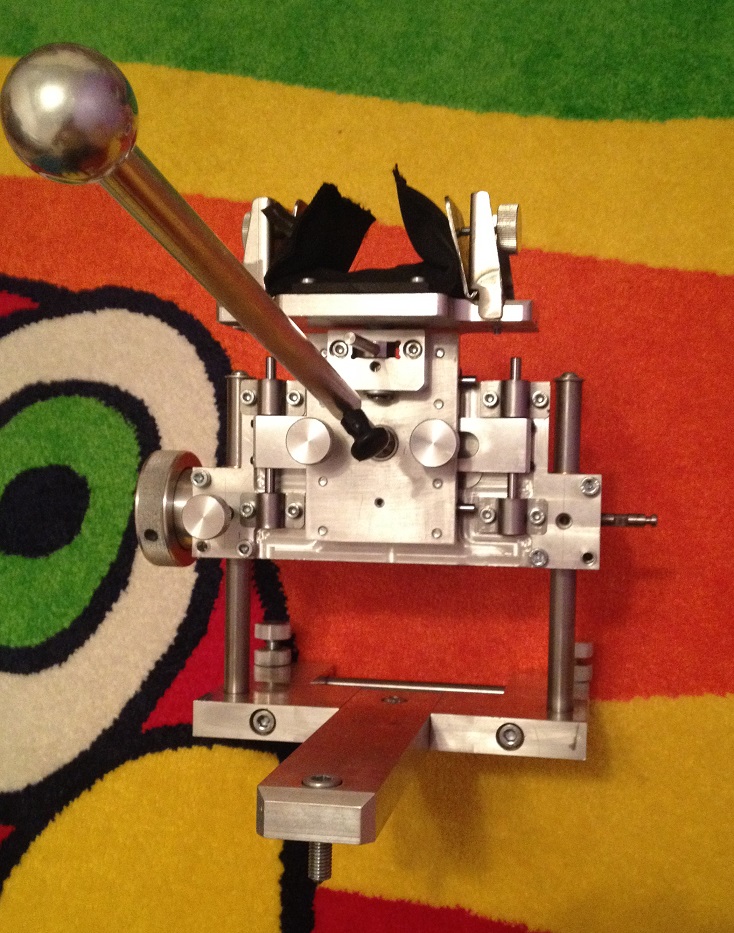 Основание выполнено сборным из 4-х дюралевых пластин толщиной 20 мм, задняя и центральная пластины в месте соединения отфрезерованы на половину толщины и соединены внахлест. Все надежно стянуто болтами. Основание стоит на трех болтах, два передних с контрящей гайкой регулируемые по высоте. Между передними пластинами впрессован пруток для переноски упора.