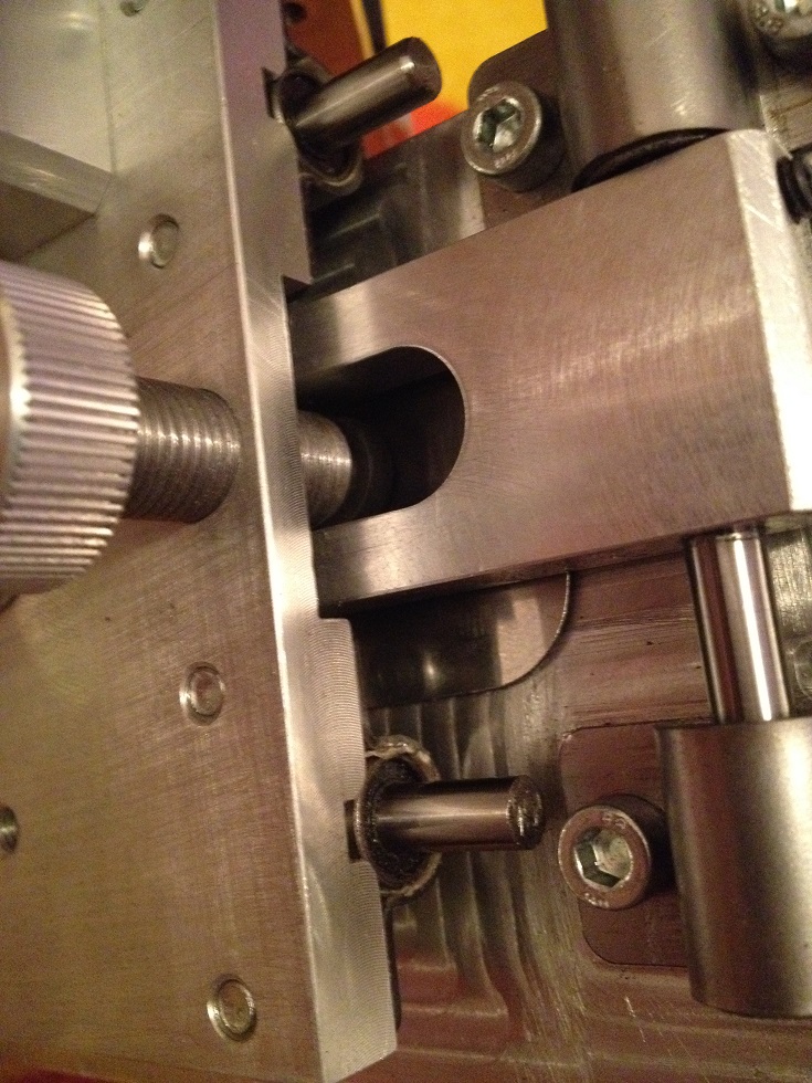 На подвижной пластине имеется два винта для регулировки тормоза. Тормоз нужен чтобы упор не “падал” под собственным весом и весом винтовки, и усилие на рычаге было постоянным на подъёме и опускании (также это достигается регулировкой положения трёх подвижных грузов на противовесе). Бобышки тормоза из фторопласта с добавлением графита подпружинены и опираются на гладкие пластинки из нержавейки.