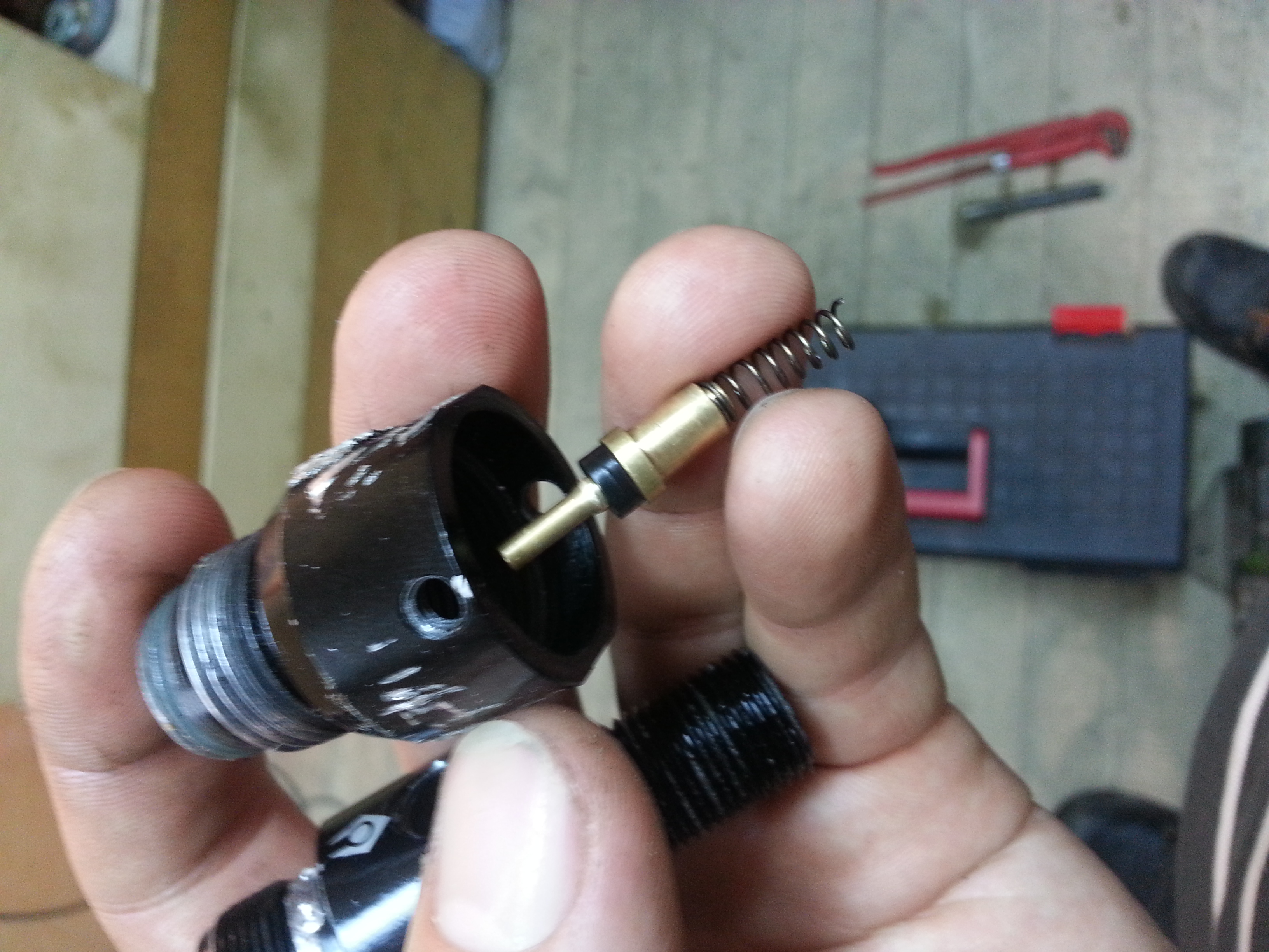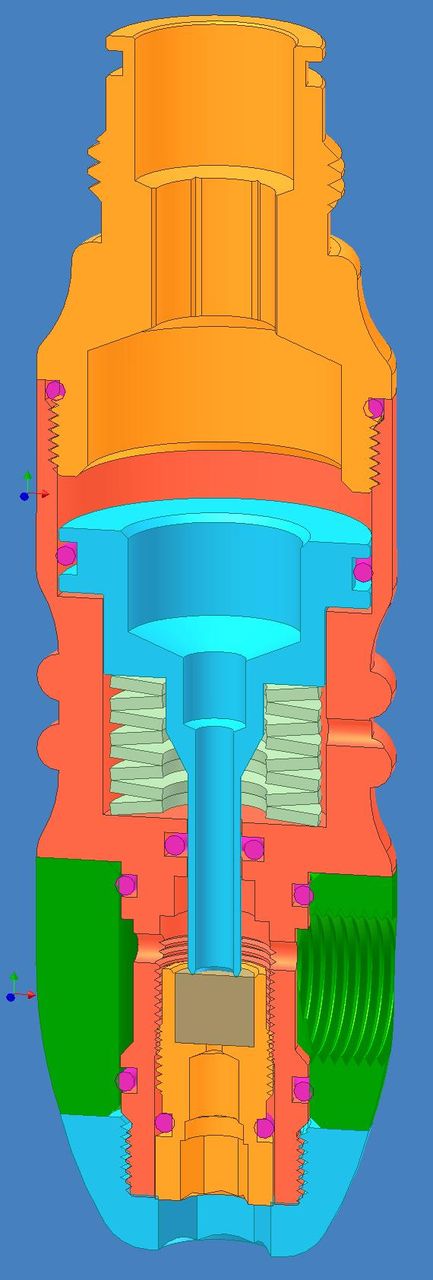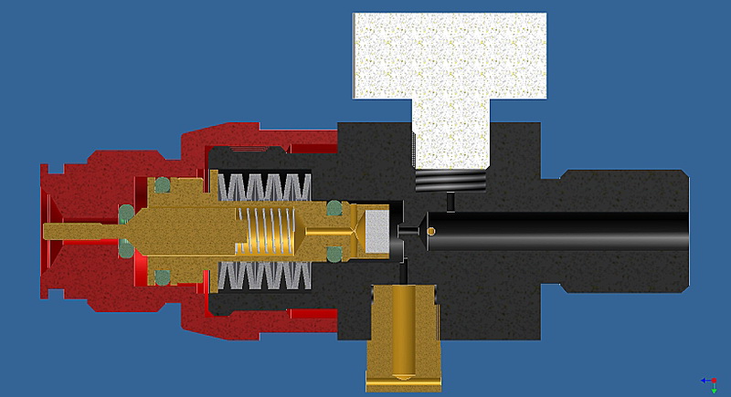 Сдесь входное давление работает исключительно по диаметру отверстия в корпусе (черная деталь), на которое давит поршень, а его можно сделать хоть микроскопическим! Это позволяет настолько уменьшить силу влияния входного давления, что влияния не будет вообще. Но