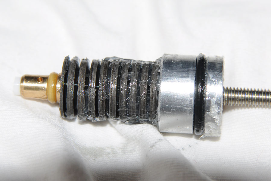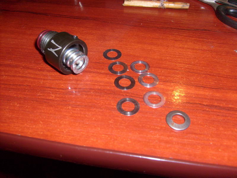 К слову о регулировке, редуктор был на тарельчатых пружинах - общую толщину сборки оставил без изменений, а увеличил только жесткость (изменена конфигурация + совковая шайба). Как результат со стоковых "заморских" 850 psi стало "наших" 90 атм. Куб стал пихать стабильно ..77 тяжелой.