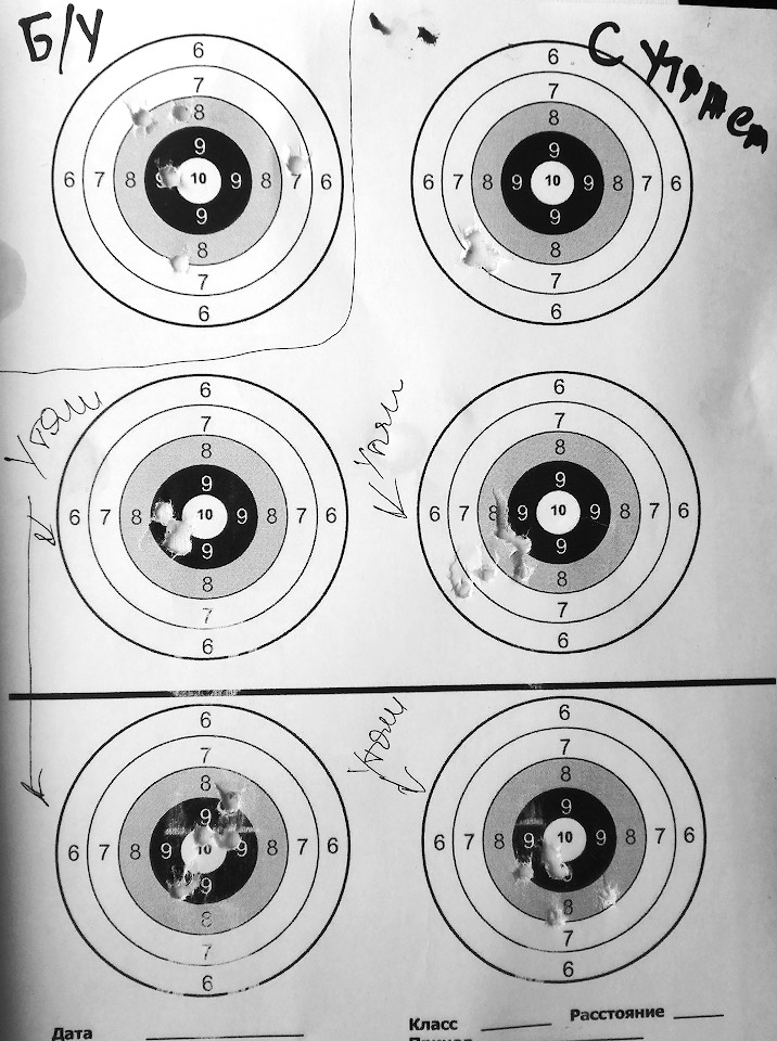 вот, стрелял сериями по пять пуль квинтор Бета - ощущение что они лучше всего летят, плотно садятся на нарезы. Слева сверху без утяжа, потом против часовой по улитке с утяжем и попутной пристрелкой прицела. Там где меньше пяти дырок - пули одна в одну заходили.