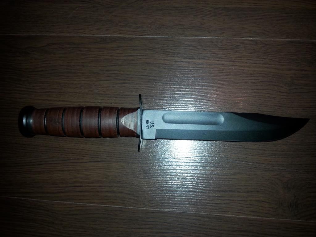 Модель 9158 KA-BAR US Army — это, прежде всего, отличный тактический нож, приобретать и использовать который можно и в этом качестве, а не только как подарочный и коллекционный экземпляр. Он характеризуется гладкой режущей кромкой клинка длиной почти сто семьдесят восемь миллиметров, толщиной обуха в четыре миллиметра, качественной углеродистой сталью и использованием кожи для оплетки рукояти. Отличает его от аналогичных моделей гравировка из порошкового металла на клинке (при желании можно самостоятельно удалить).