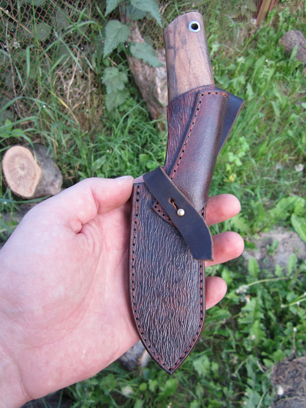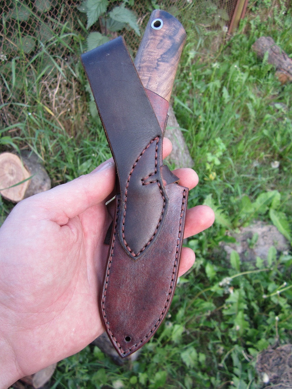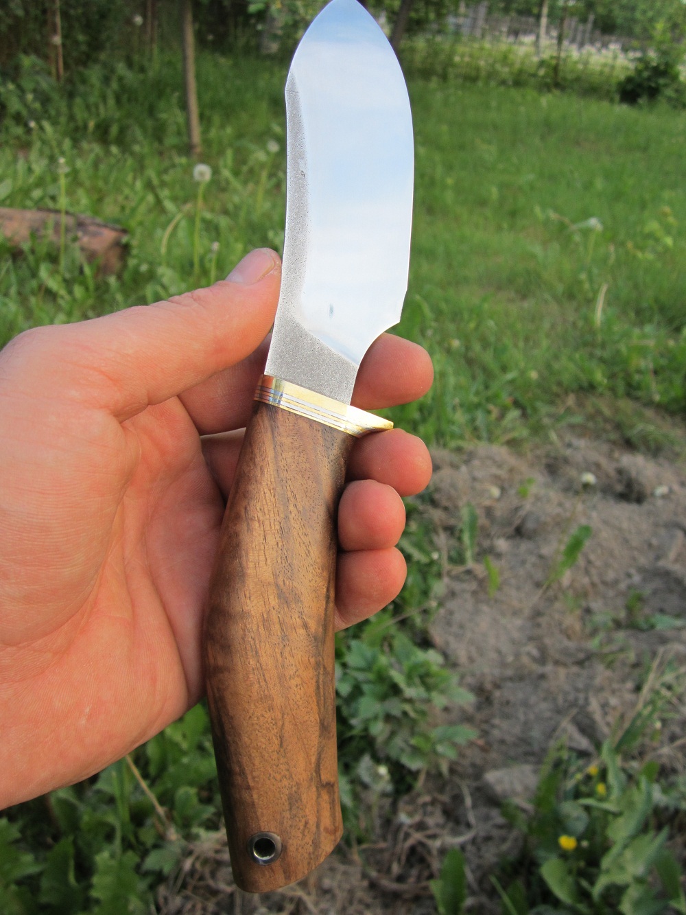 Рукоять из ореха, нержа, латунь - 125-110 мм. Покрыта Шафтолом в три слоя.Ножны кожаные. Покрыты кремом. Цена 2 млн.руб.