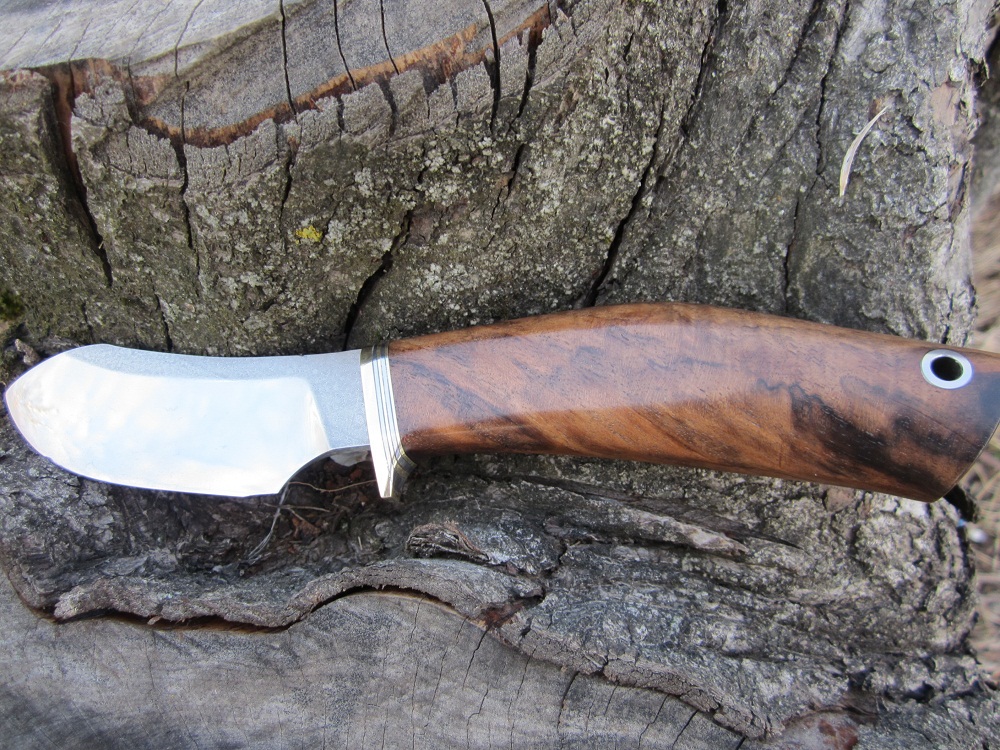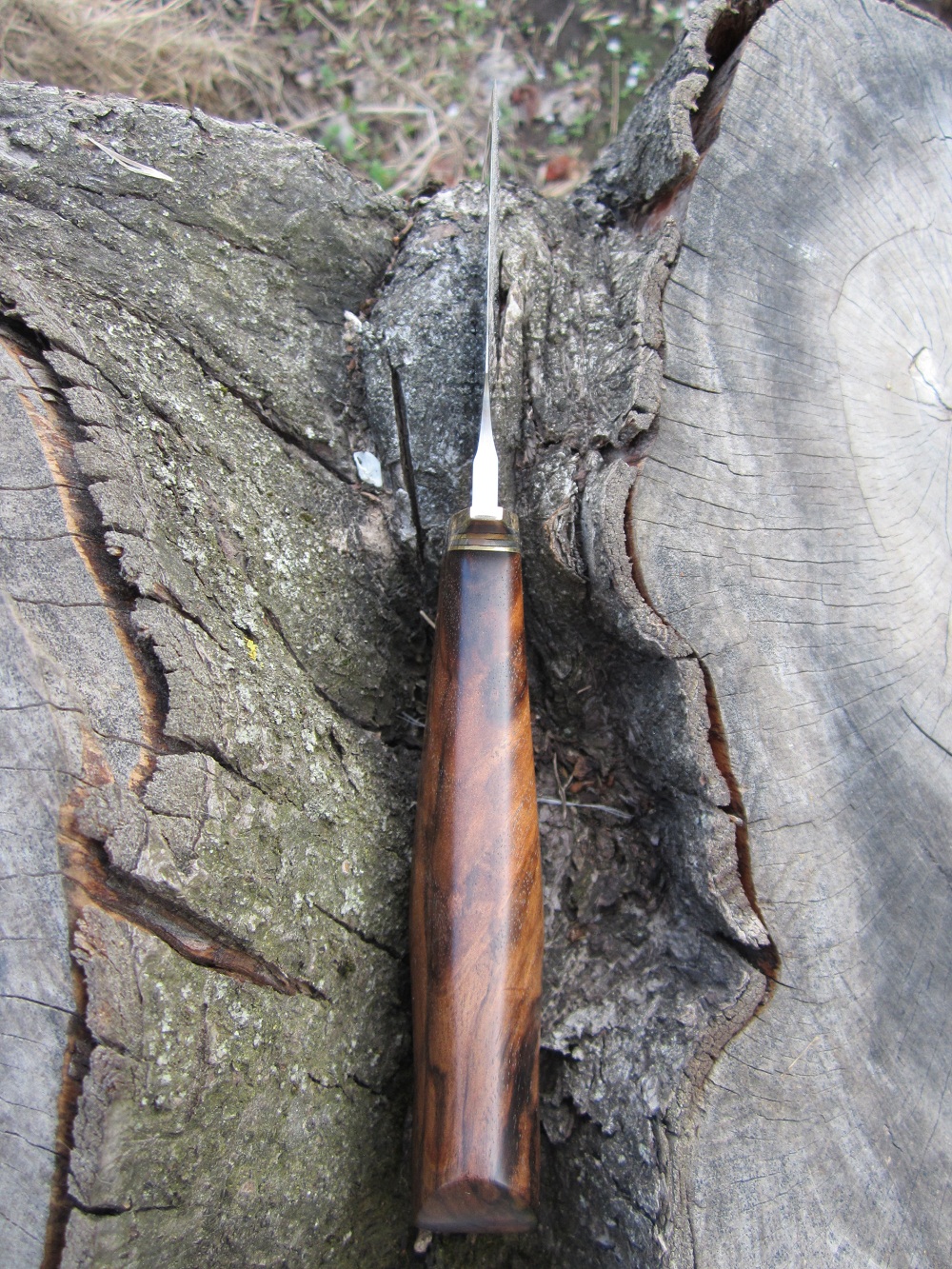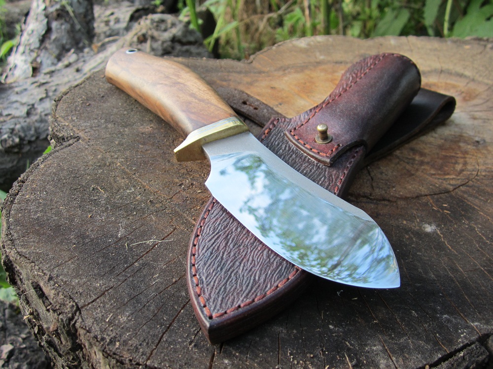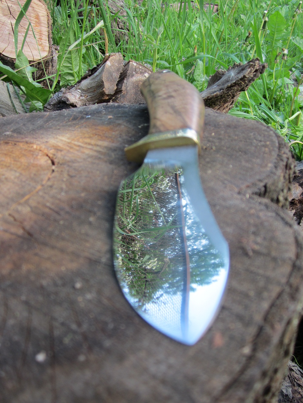 Рукоять из ореха, нержа, латунь - 125-110 мм. Покрыта Шафтолом в три слоя.Ножны кожаные. Покрыты кремом. Цена 2 млн.руб.