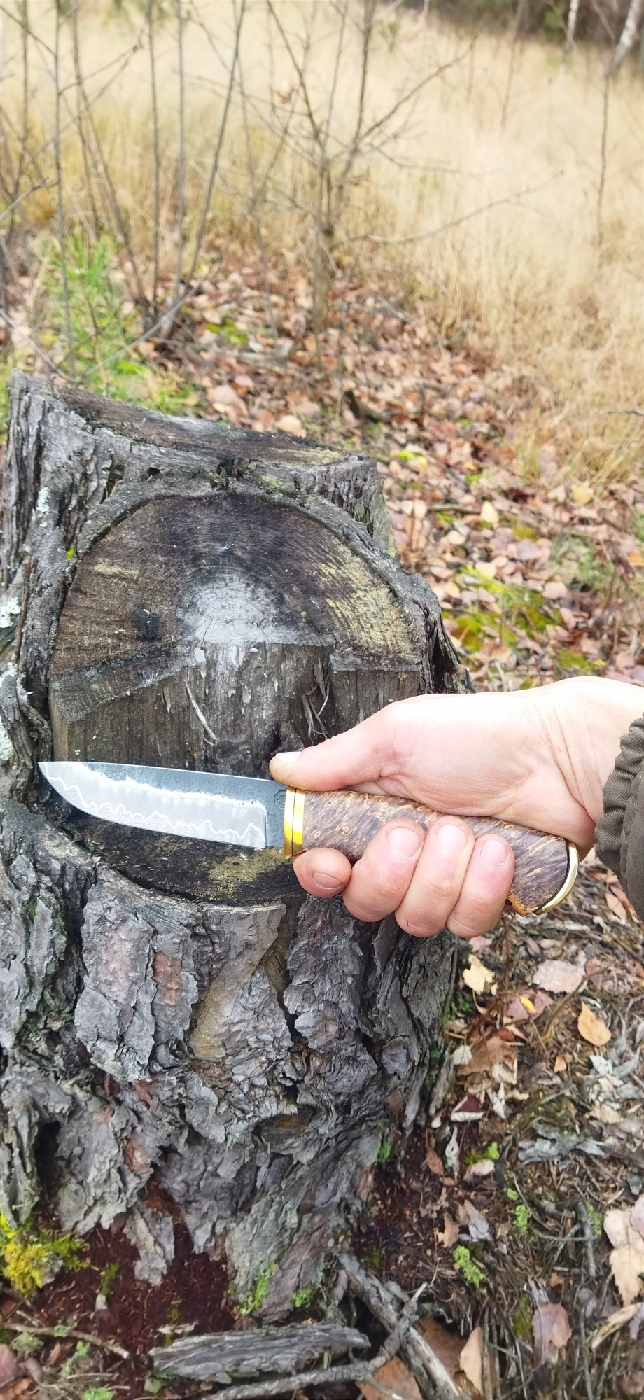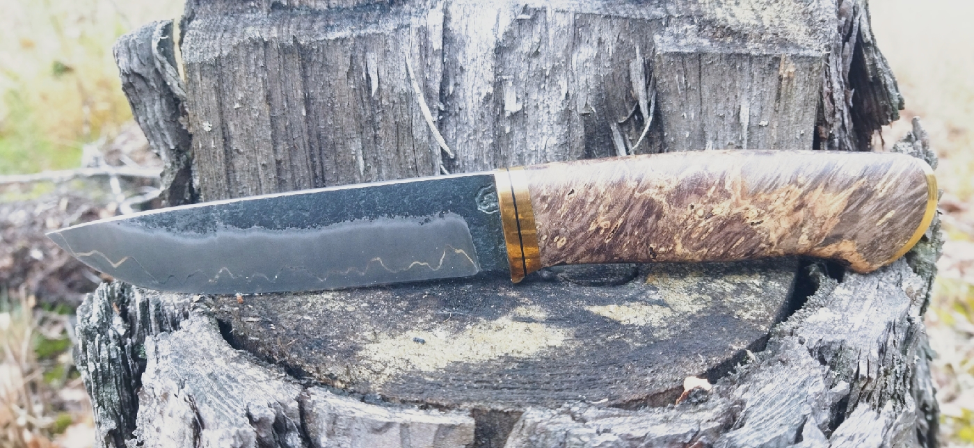Нож с кованым ламинатным клинком. Центральный слой Х12МФ (62-63 HRC). Клинок от А.Шпаковича.