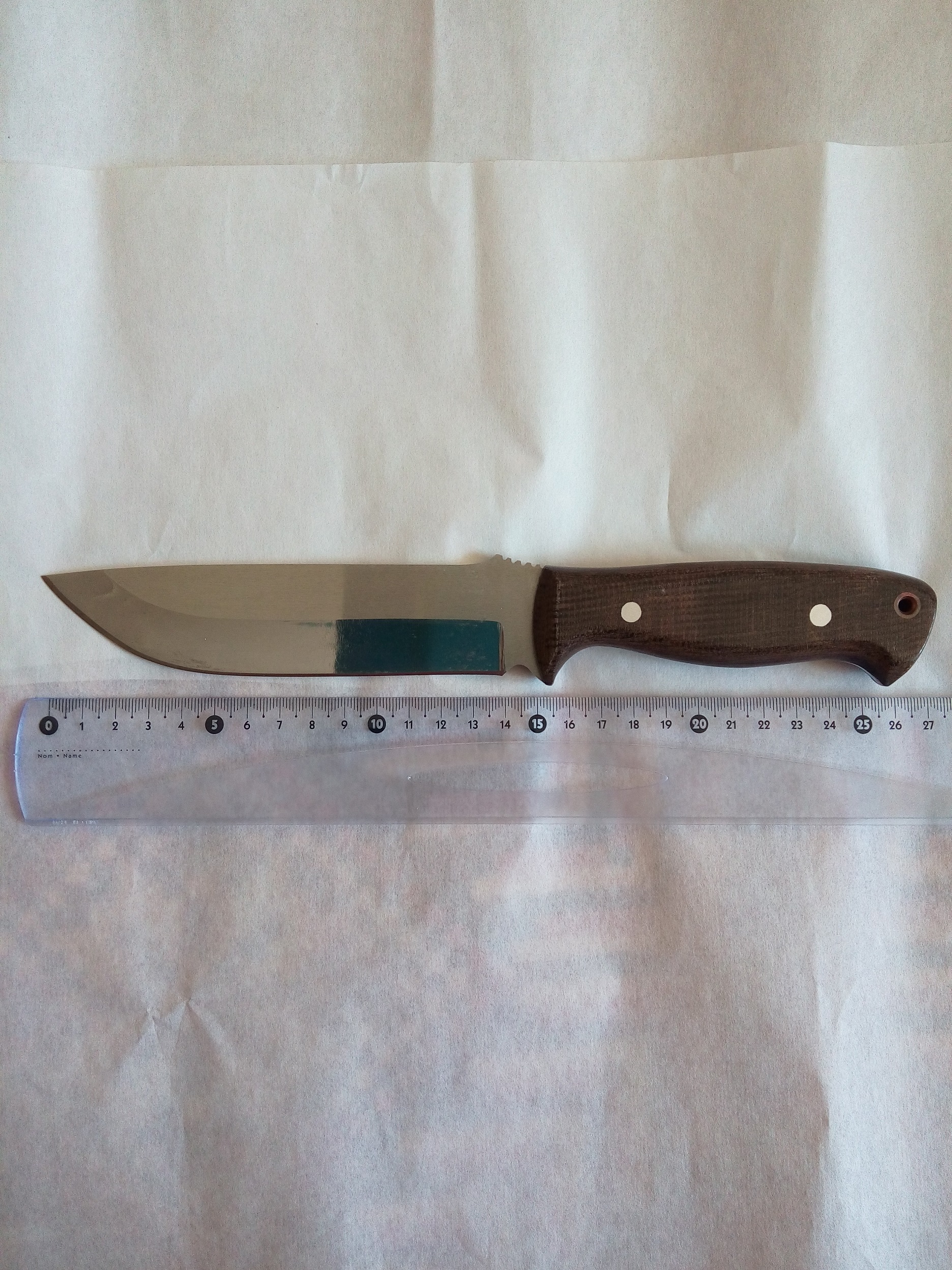 Нож делался по подобию чего-то среднего между Bark River Bravo 1 и Bark River Maroon Linen Micarta из стали 40х9с2, нож кованный и закален на 58HRC (проверено на заводе твердомером), рукоятка из текстолита. Длинна клинка 150мм, обух 2,8мм, ширина 34мм. Цена 450 000 рублей.