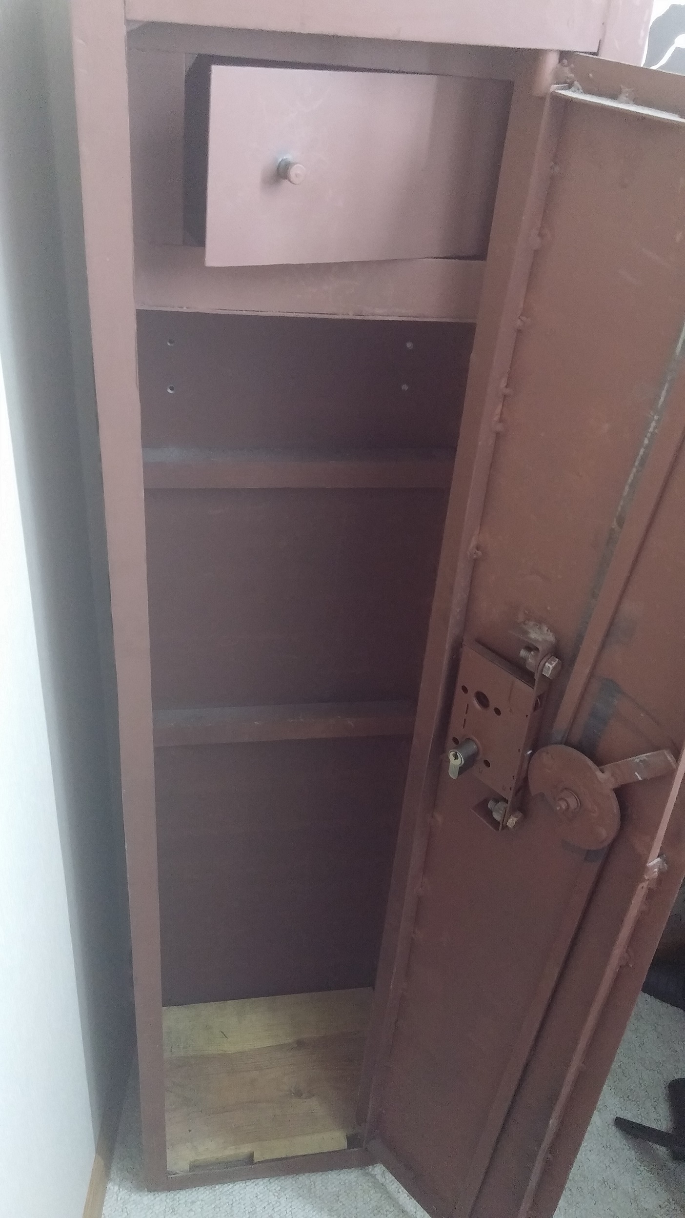 Сейф оружейный высота 1420 мм ширина 355 мм глубина 255 внутренняя высота до ящика для патронов 1160 мм. Сейф из старых, дастался с покупкой квартиры, только у меня 23 года стоит. Окрашен грунтовкой, замок ригель, новая сердцевина, 4 ключа.