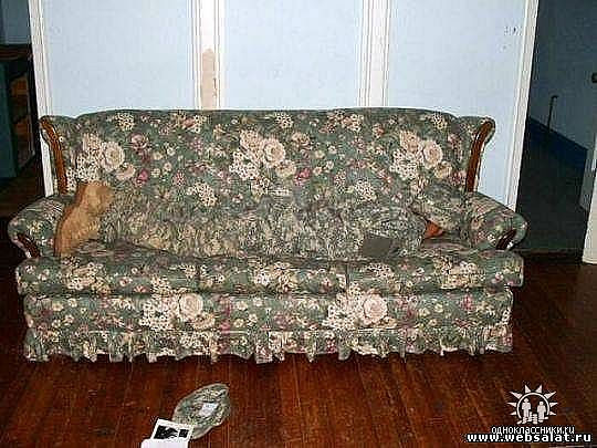 shaman-sol писал(а):Диван на фото это развитие ветки про чувака с луком на фоне дуба - тупо фотомонтаж. Опять грани слизаны, вставки на теле камуфла из обивки дивана, размытие..