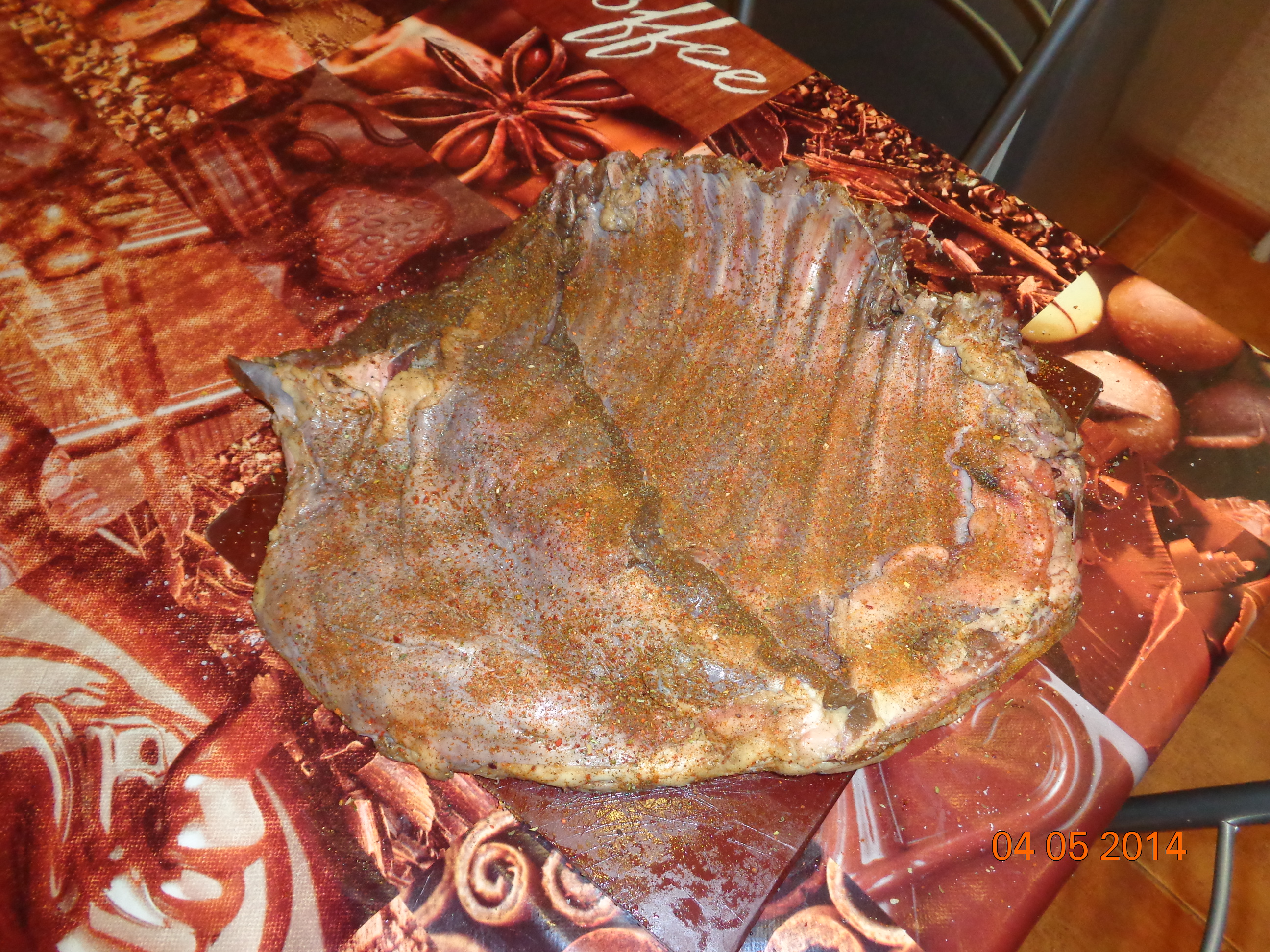 Итак,друзья после очередной ревизии морозильной камеры,были обнаружены рёбрышки добытого прошедшей осенью в кукурузе сеголетка.Решено было было их запечь,сказано -сделано...Ребра размораживаются,вытираются на сухо бумажными полотенцами и натираются красным и чёрным перцем,и специями купленными на комарах...,оставляем это на пару-тройку часов,чтоб пропитались.Разогреваем духовку(до скольки градусов не знаю,так как я в духовках не разбираюсь и туда не лезу,этим занималась супруга),рёбра в пакет для запекания...запекаем...за минут 15-20 до готовности достаём из духовки и всё это дело обмазываем медом...ожидаем...достаём из духовки,достаём из пакета,даём минут 5-10,чтоб дух устоялся,ну и пожалуйста,приятного аппетита!!!Всем добрым людям ни хвоста ни чешую,и удачных выстрелов!!!