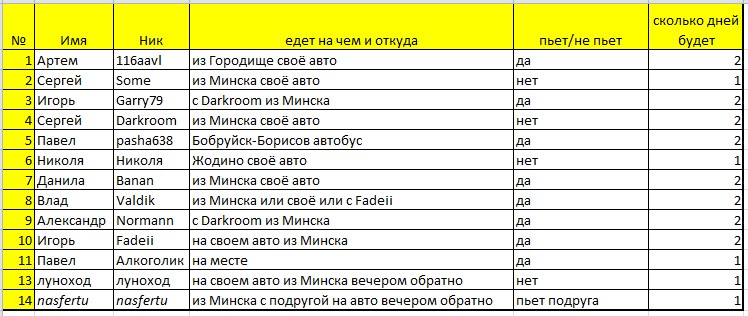 Информацию нужно подать как можно скорее, ибо пора начинать затарку, Алкоголик как в прошлый раз всё купит, потом ему на месте гроши отдадим. Ориентировочный бюджет на два дня около 300 000 белорусских рублей (водка, шашлыки, еда и т.д.), ссобойки типа трехлитровой банки тещиных огурцов - приветствуются.