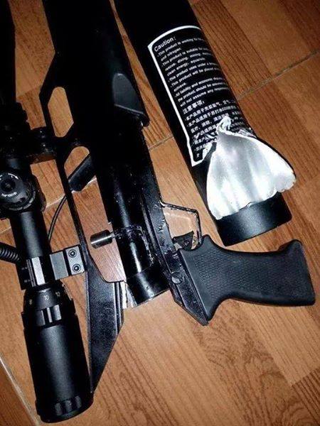 я не знаю как должен "рваться" баллон-(вроде как просто щель должна быть) по фото сложно ,что либо узнать-не хватает профильных фоток колбы(в месте крепления к винтовке),но если предположить-что это имело место быть-значит колба разорвался именно в месте прилегания щеки -баллон разорвался и большой выход энергии погнул железо вниз.По логике вещей всё так и было,профильные фото колбы должны были показать -небольшую прогнутость колбы в месте крепления к железу-ведь именно горловина колбы погнула железо винтовки.Хотя при такой энергии и сама колба должна была загнутся в месте разрыва ещё больше и принять Г образную форму.сугубо мои предположения-есть ли где видео -где направленно рвут баллоны,резервуары сжатым воздухом?